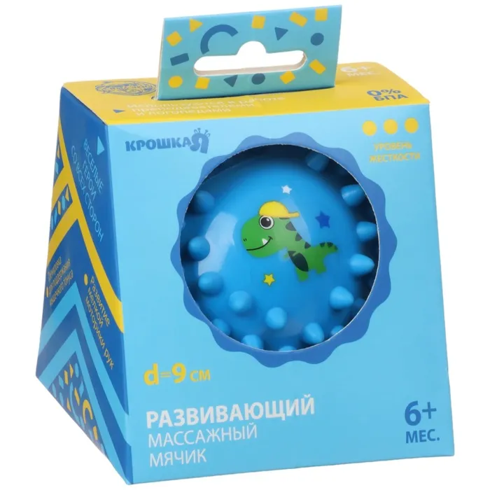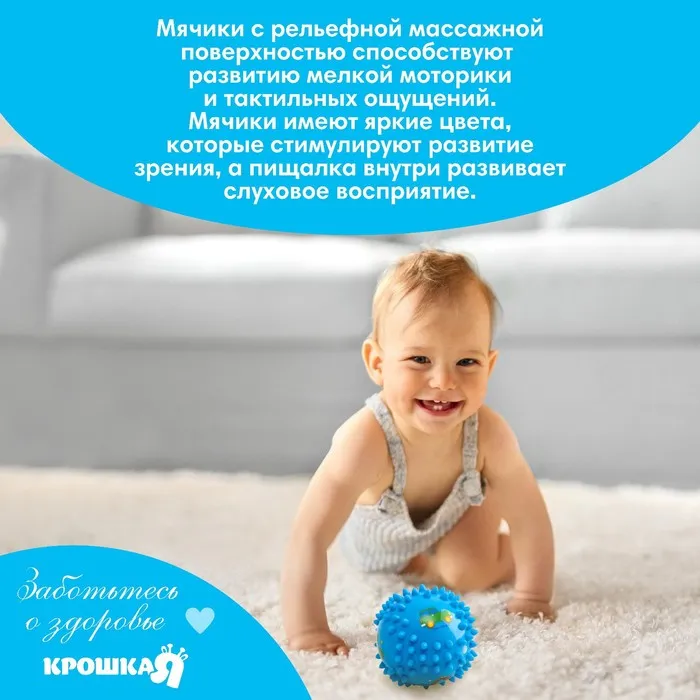 Мячики торговой марки Крошка Я обладают рельефной поверхностью, способствующей развитию мелкой моторики и тактильных ощущений. Фактурная поверхность стимулирует и благотворно воздействует на нервные окончания, ответственные за большинство процессов в организме! Игрушкой можно не только играть в комнате, можно купаться, заниматься и делать массаж крохе. Яркие цвета мячиков помогают развить зрение.