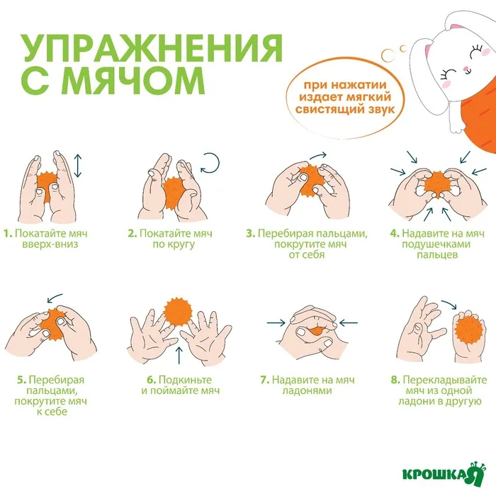 Покажите младенцу, как сжимать мячик, катать и бросать его. С ребёнком постарше разучите пальчиковые игры. Они стимулируют мышление. Повторяя строчки стишков и выполняя простые действия с предметом, малыш быстрее усвоит, где находится левая и правая стороны, верх и низ, запомнит цифры и названия цветов.
