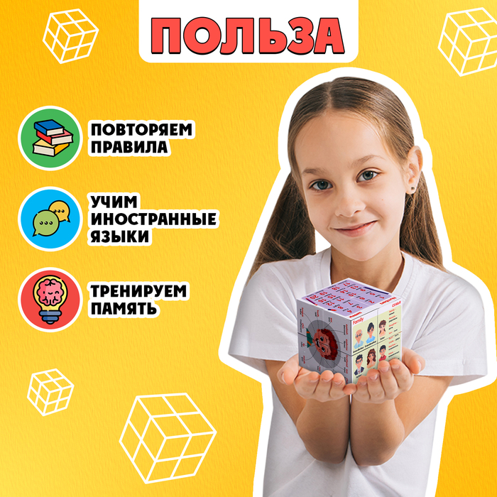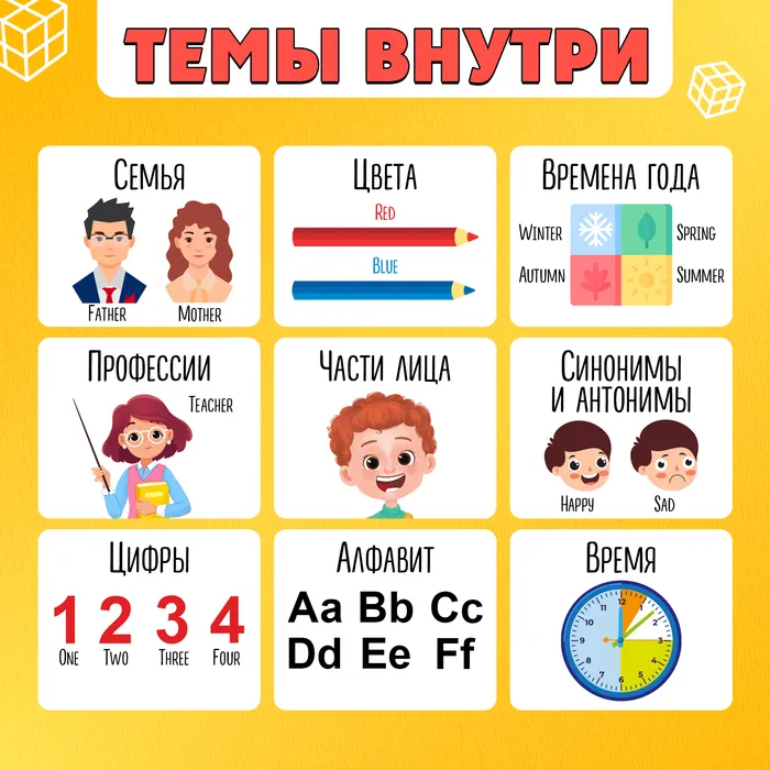 «Умникуб: Английский язык — развивающий трансформер для малышей. С такой игрушкой ребёнок в игровой форме выучит основные темы английского языка. Яркие картинки привлекут внимание непоседы, а таблицы и примеры, изображённые на нём, помогут повторить и закрепить знания.