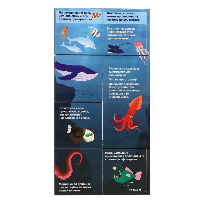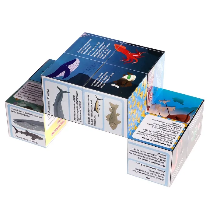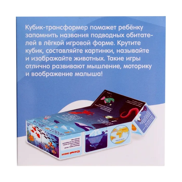 - Игра с кубиком помогает развивать логическое мышление, память, мелкую моторику и кругозор. Ребёнок тренирует внимание, собирая картинки, и запоминает интересные факты об океанах.