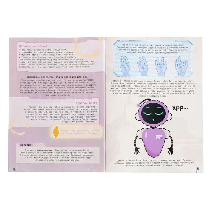 Нейротренажёр для развития обеих рук и мышления станет отличным выбором для детей от 7 лет. Этот увлекательный набор включает задания и загадки с тематикой роботов, что делает процесс обучения логики и развития моторики ещё более интересным.