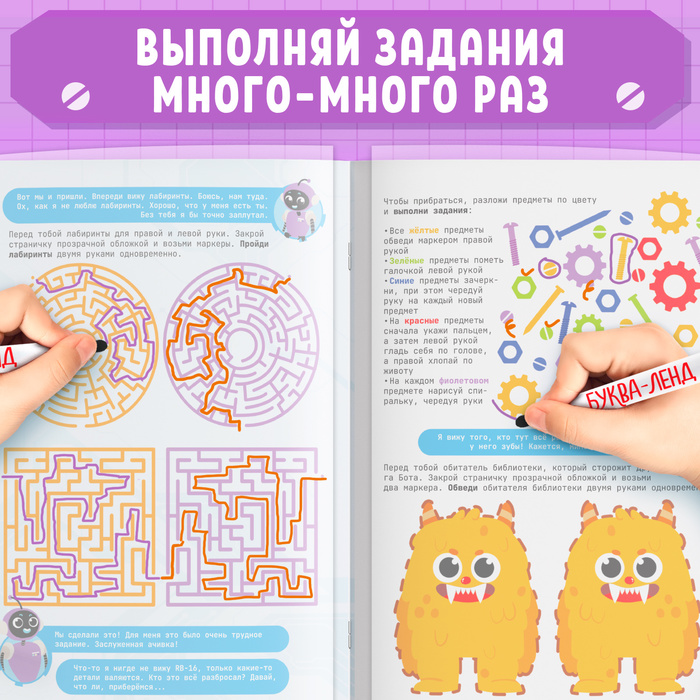 Это не просто книга с заданиями — это инструмент для увлекательного и полезного досуга. Ребёнок погружается в мир логических задач и креативных упражнений, работая обеими руками, что способствует гармоничному развитию мозга. Формат позволяет родителям и детям проводить время вместе, выполняя задания и обсуждая результаты.