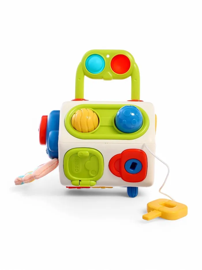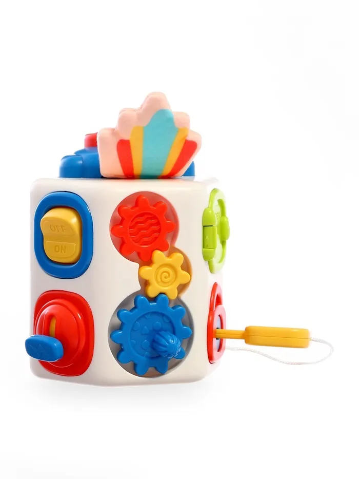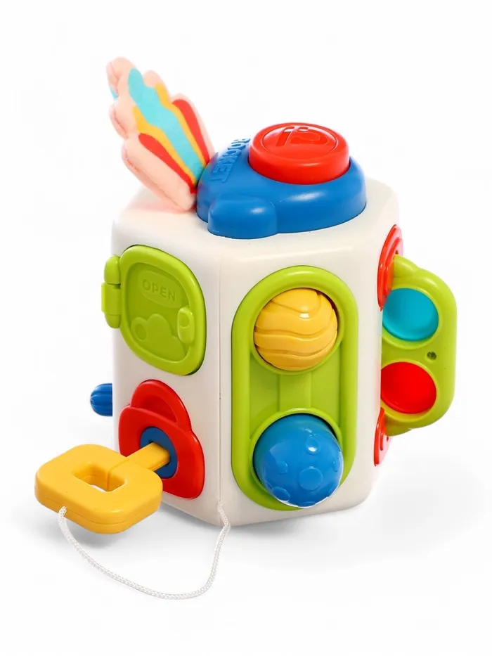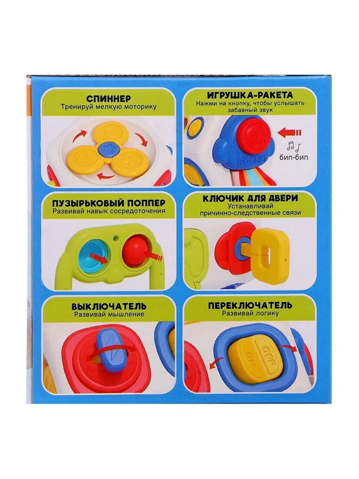 - 9 функций в одной игрушке: спиннер, поппер, игра с ключом, игрушка-ракета, выключатель, переключатель, шестерёнки, игра-стучалка и сенсорная панель.