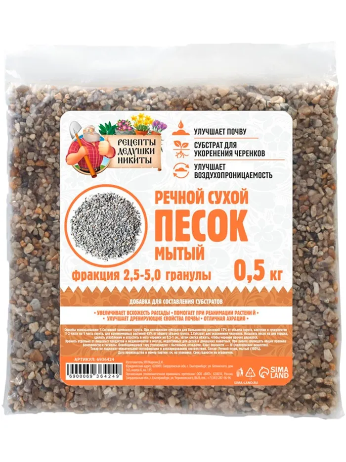 Речной песок "Рецепты дедушки Никиты", сухой, фр 2,5-5,0, гранулы, 0,5 кг — Характеристики