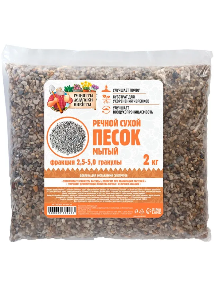 Речной песок "Рецепты дедушки Никиты", сухой, фр 2,5-5,0, гранулы, 2 кг — Характеристики