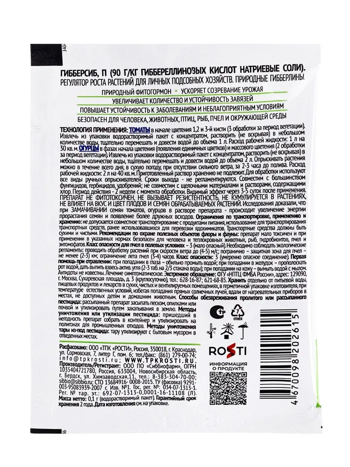 Регулятор для роста "Гибберсиб", овощное, концентрат, 0,1 г — Характеристики