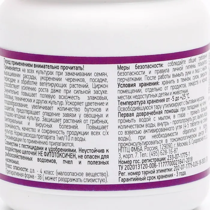 Многоцелевая добавка предназначена для ускорения прорастания семян, образования корней и интенсивного формирования плодов. Препарат «Циркон» содержит 0,1 г/л гидроксикоричных кислот, которые нормализуют обмен веществ растений и стимулируют естественную защиту от большинства распространённых фитопатогенов.