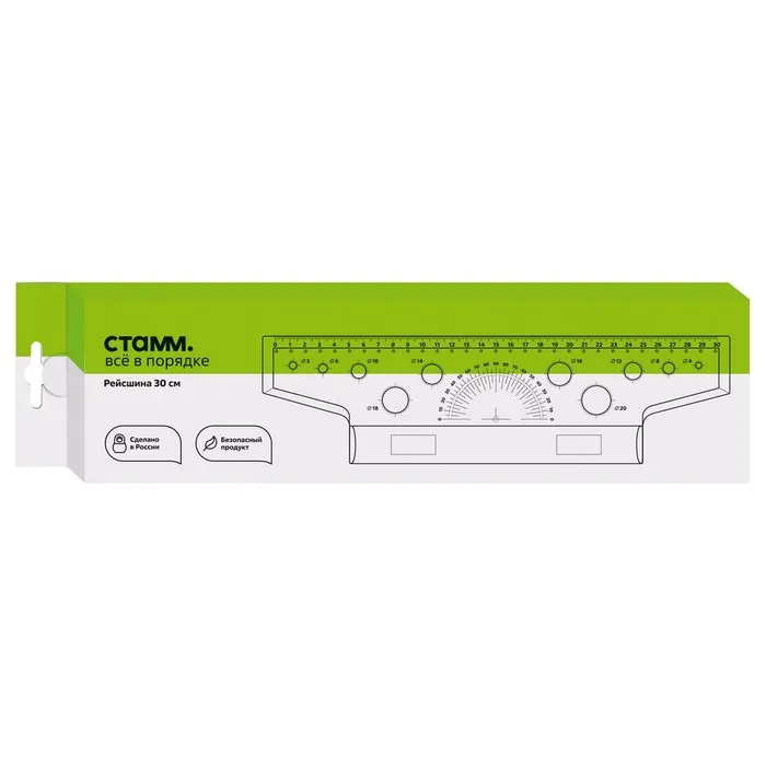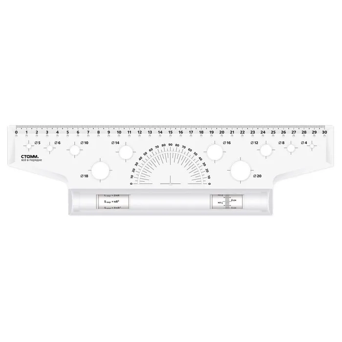 Рейсшина 30 см предназначена для выполнения чертёжных и измерительных работ. Линейка-рейсшина оборудована металлическим роликом, и идеально подходит для нанесения ровных параллельных линий. Длина шкалы – 30 см. Благодаря специальному покрытию ролика линейка не проскальзывает по бумаге. На изделии предусмотрен транспортир 180° и 10 трафаретов окружностей. Изготовлена из качественного полистирола. Рейсшина упакована в картонную коробку с европодвесом. Цвет изделия - прозрачный бесцветный.