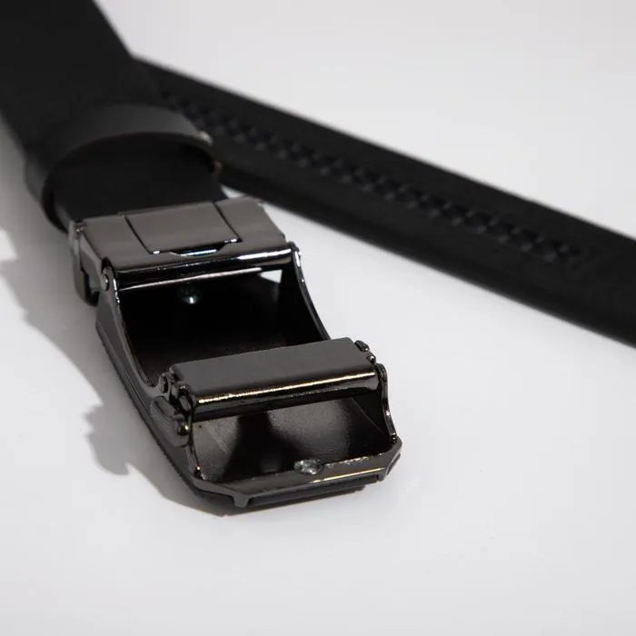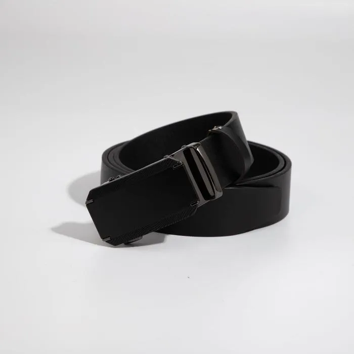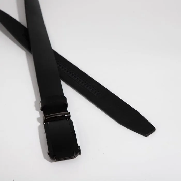 Этот мужской ремень с автоматической пряжкой сочетает практичность и лаконичный стиль. Классический черный цвет и темный металл фурнитуры подходят для офиса и повседневной носки. Автоматическая система регулировки избавляет от необходимости пробивать отверстия — длина настраивается одним движением.