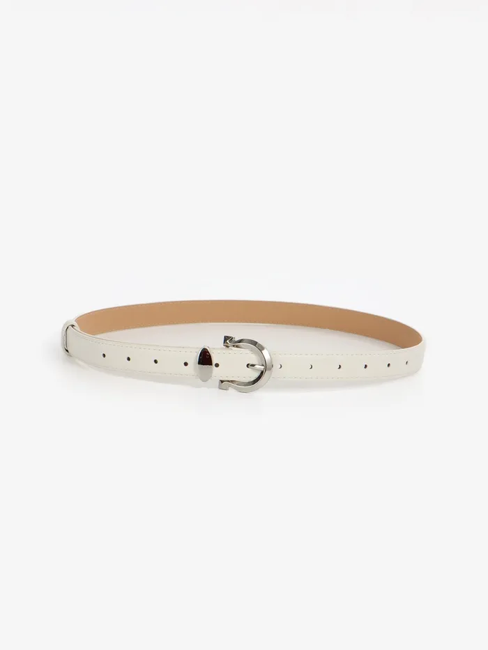 Белый кожаный ремень с серебряной пряжкой — свежий акцент для летних образов. Универсальная ширина делает его идеальным выбором для платьев и брюк.