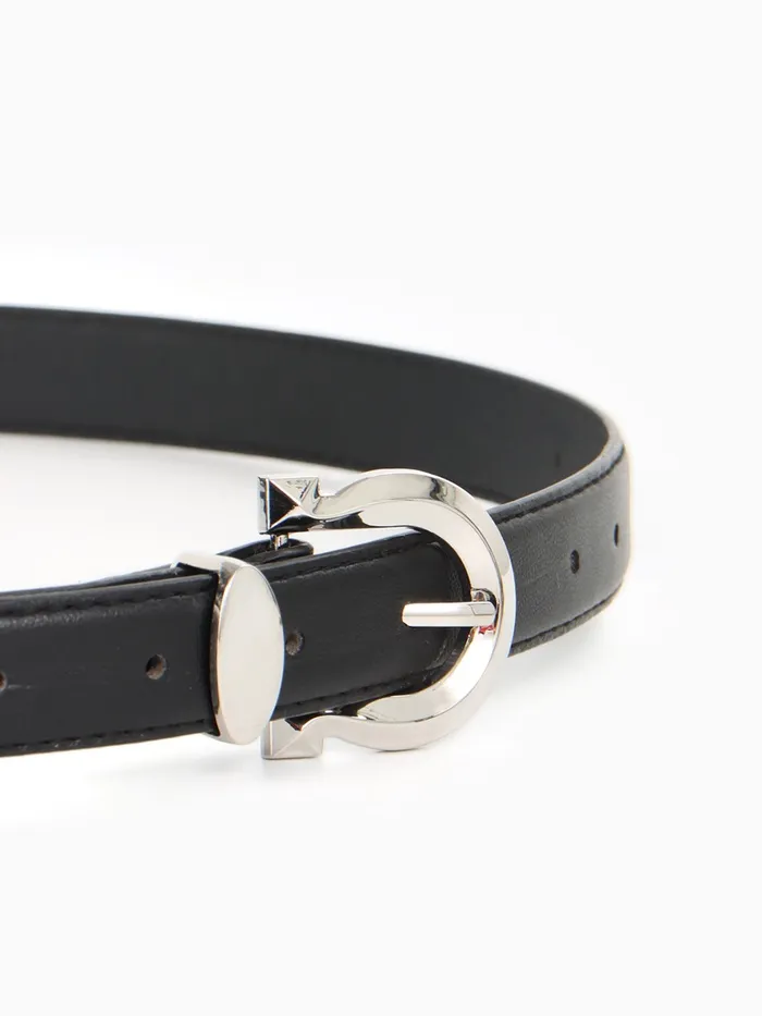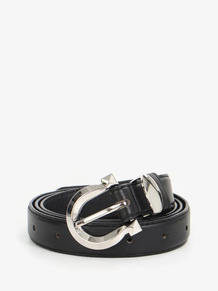 Классический черный ремень с серебряной пряжкой — универсальный аксессуар для женского гардероба. Ширина идеально подходит как для брюк, так и для платьев.