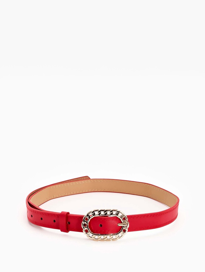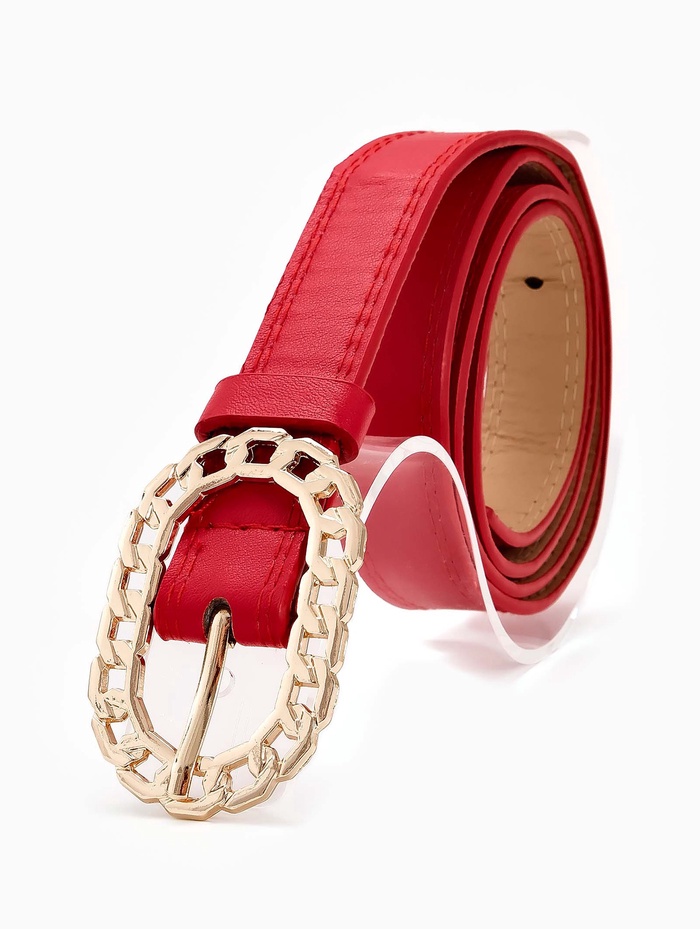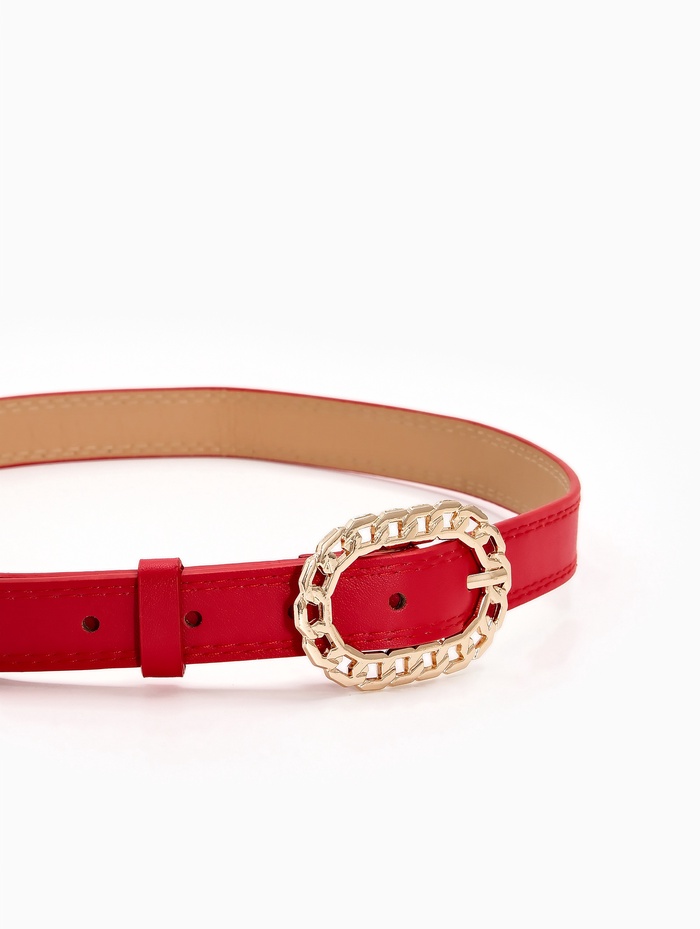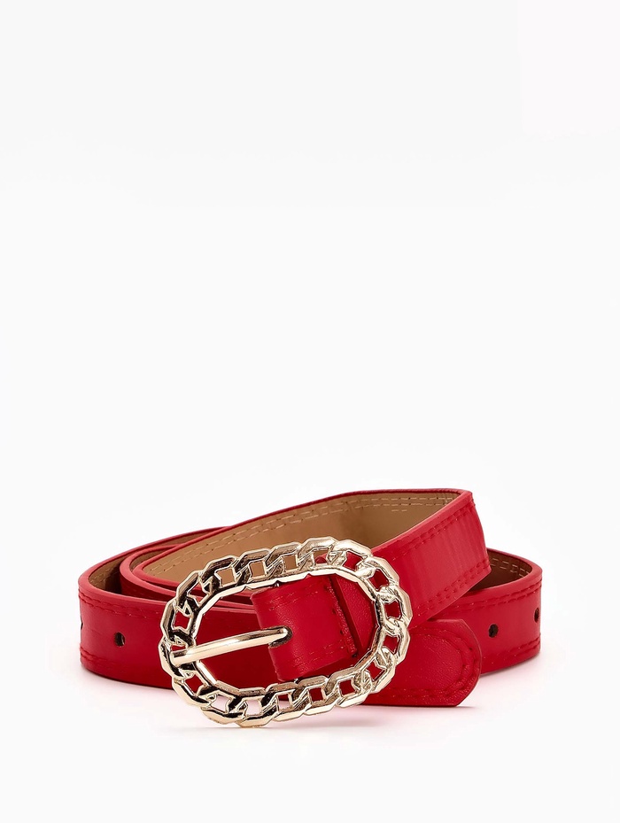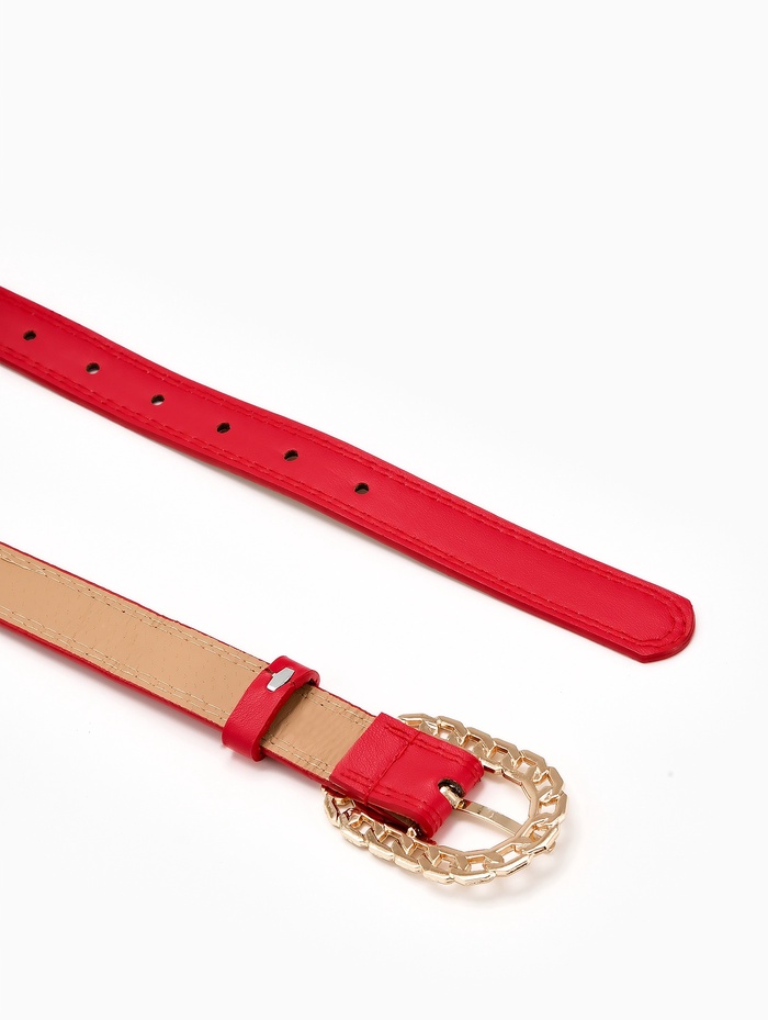Красный ремень сочетается с базовыми вещами нейтральных оттенков — черного, белого, денима. Он добавляет энергию в монохромные комплекты, не нарушая их гармонии. Золотая пряжка создает теплый акцент, сочетаясь с украшениями в аналогичной гамме, и помогает найти удобное положение благодаря одному отверстию регулировки.