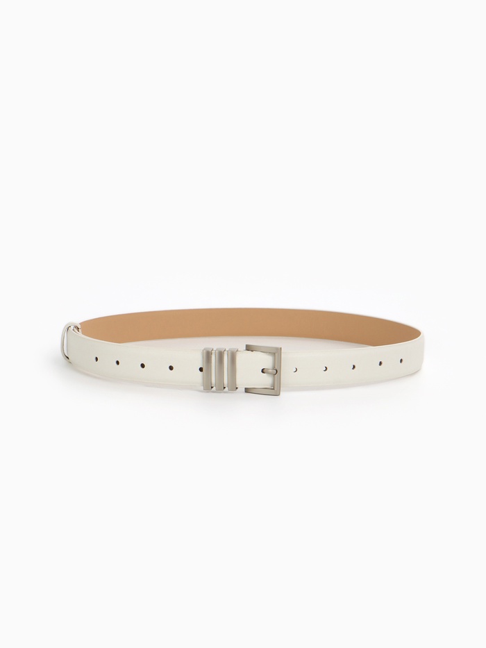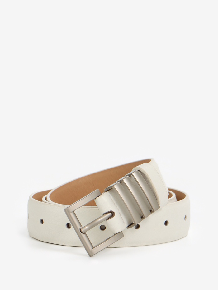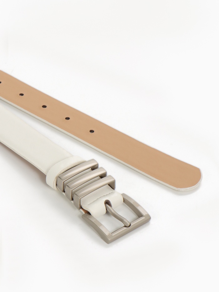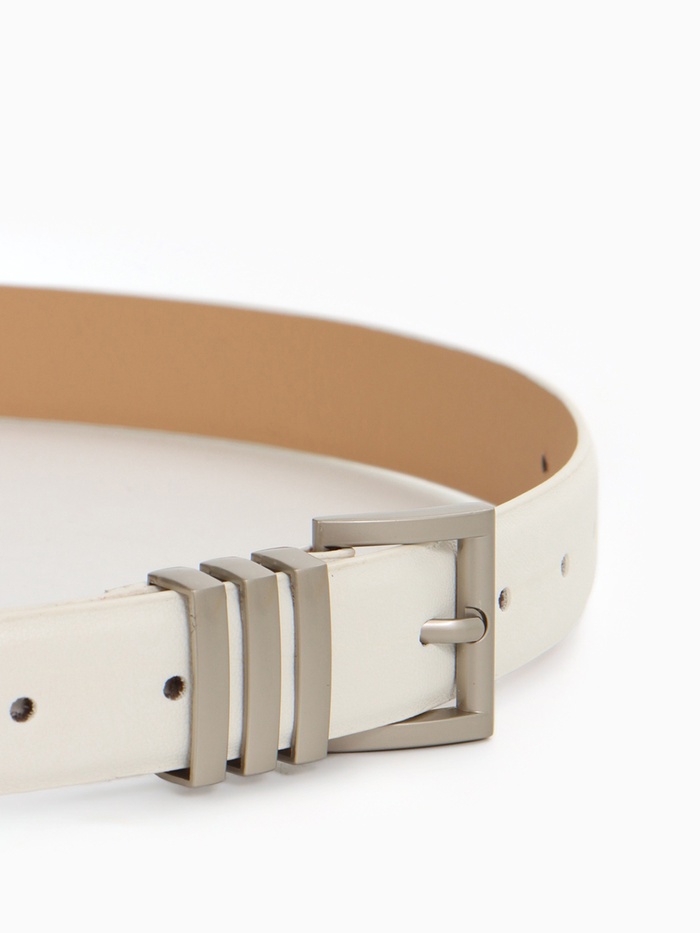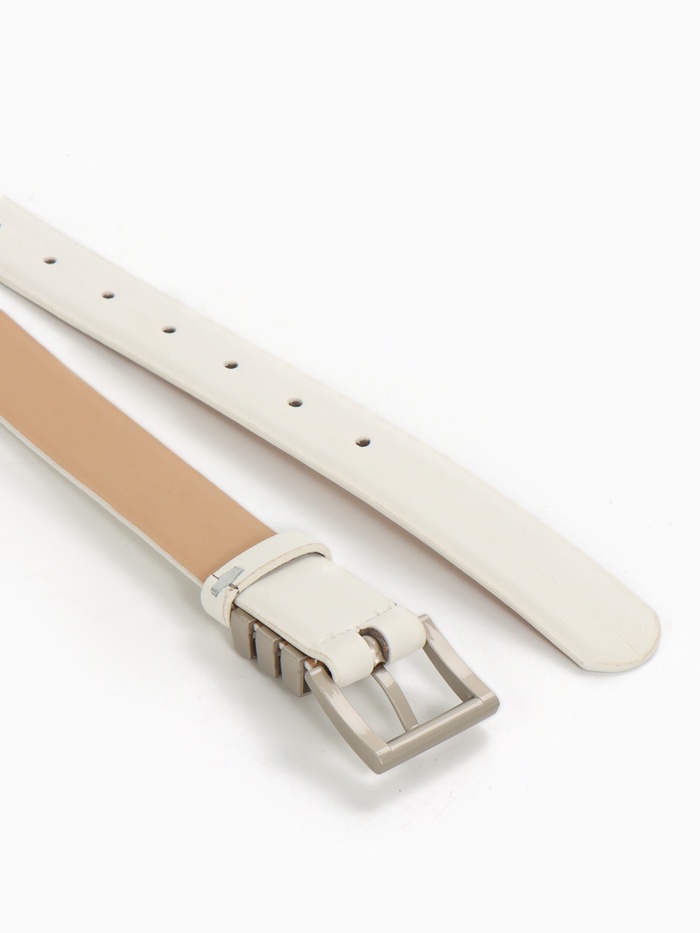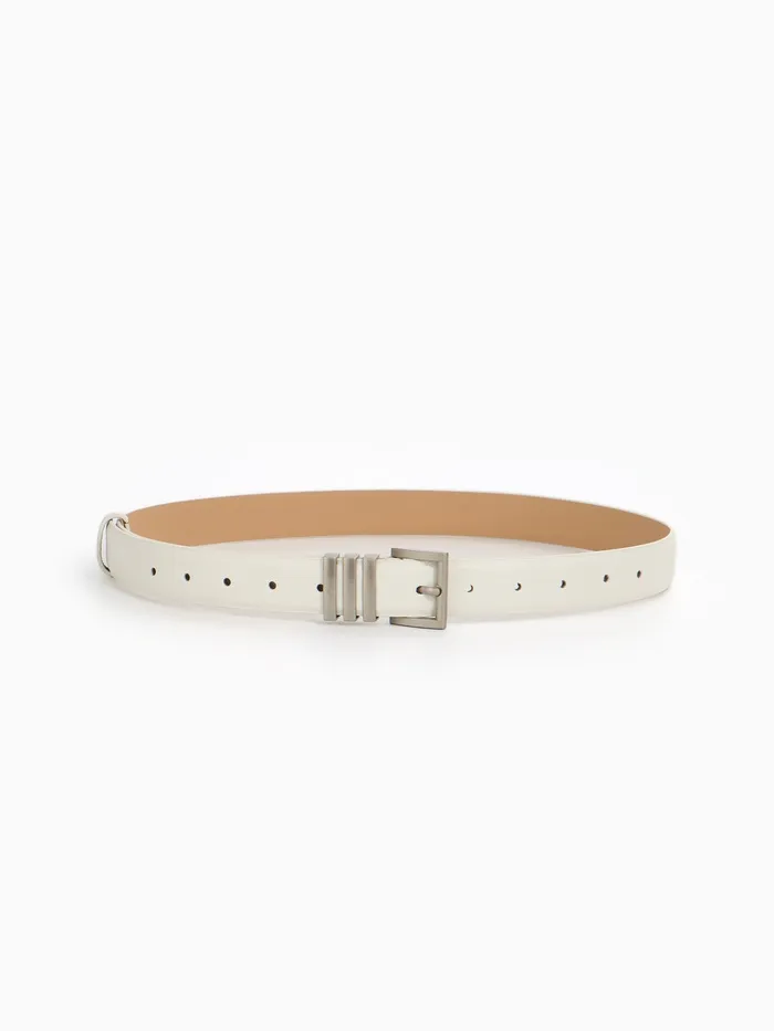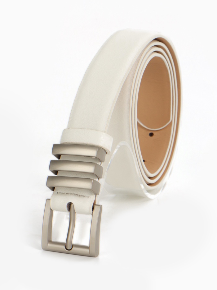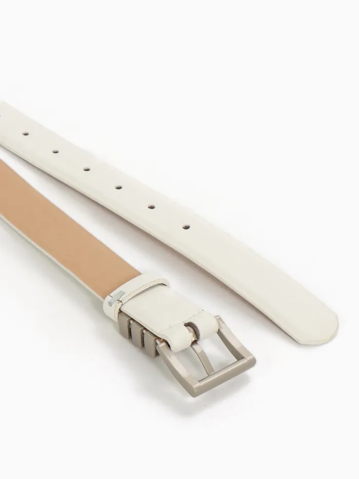 Широкий белый ремень с серебряной пряжкой — свежий акцент для летних образов. Универсальная ширина делает его идеальным выбором как для платьев, так и для брюк.
