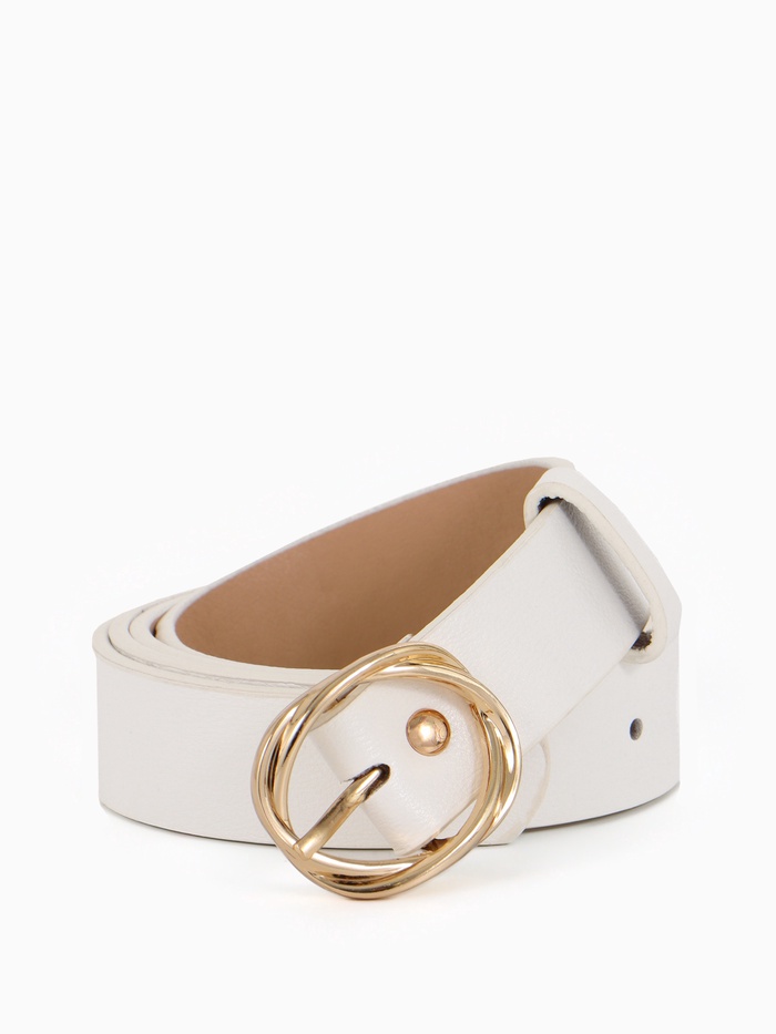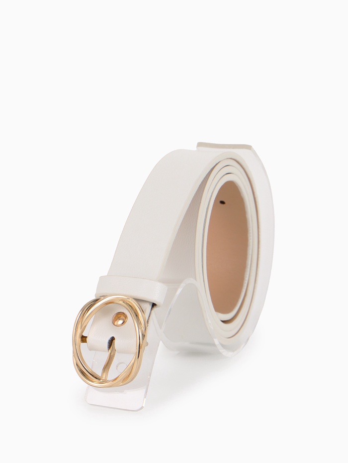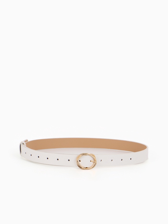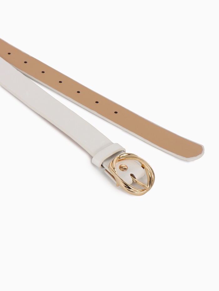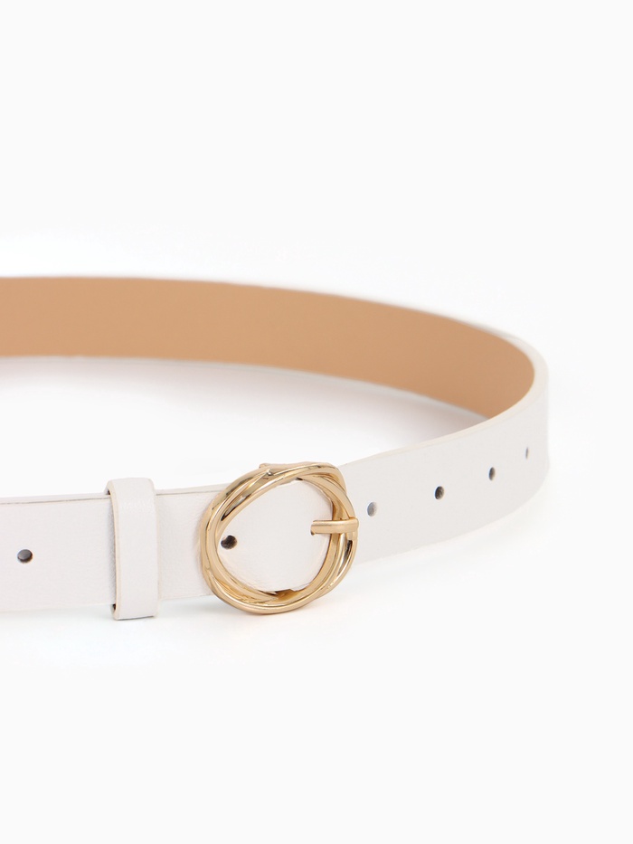 Белый ремень с золотистой пряжкой — акцент для летних нарядов и светлой одежды. Он добавляет образу завершенности, сочетаясь с платьями, брюками и юбками.
