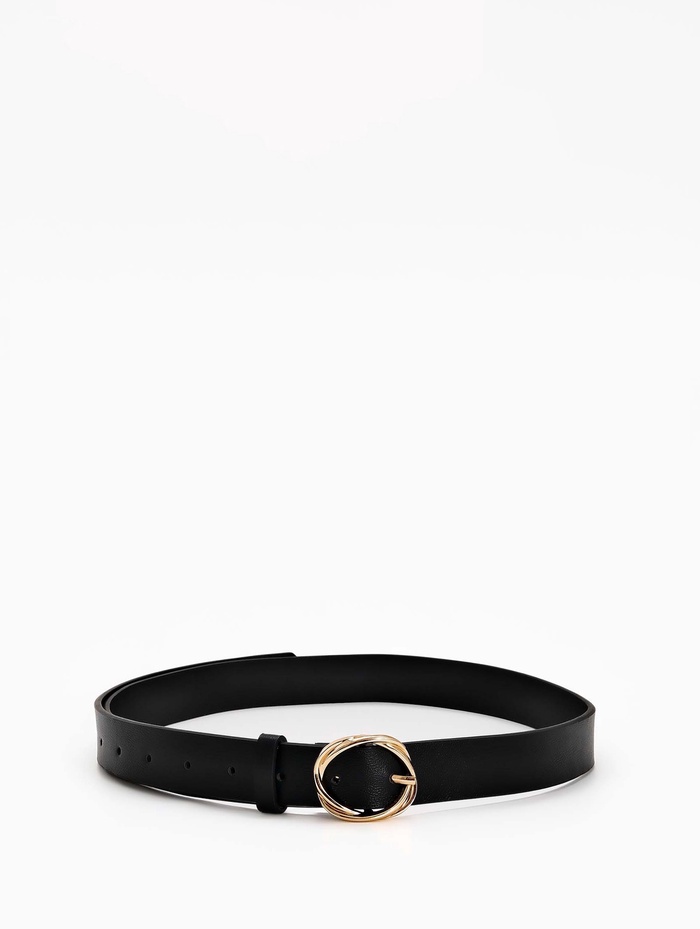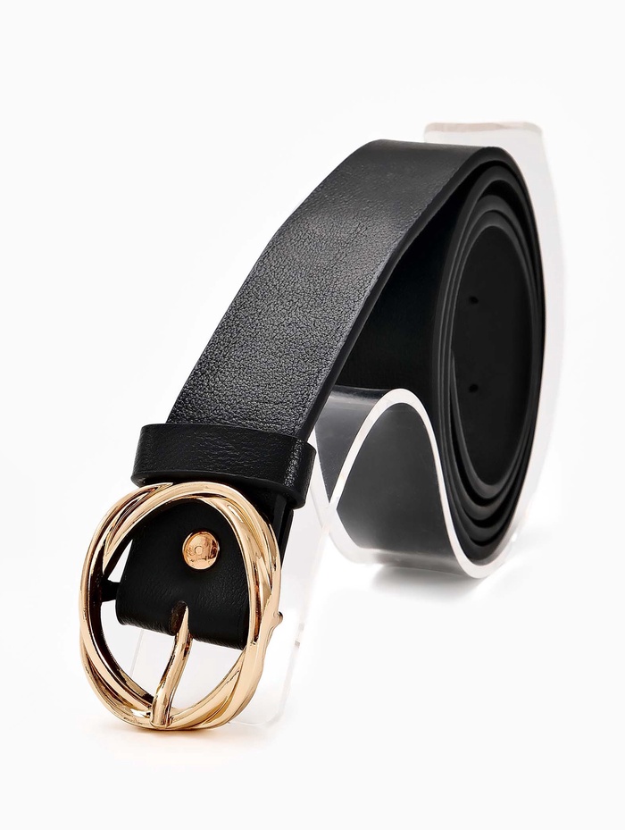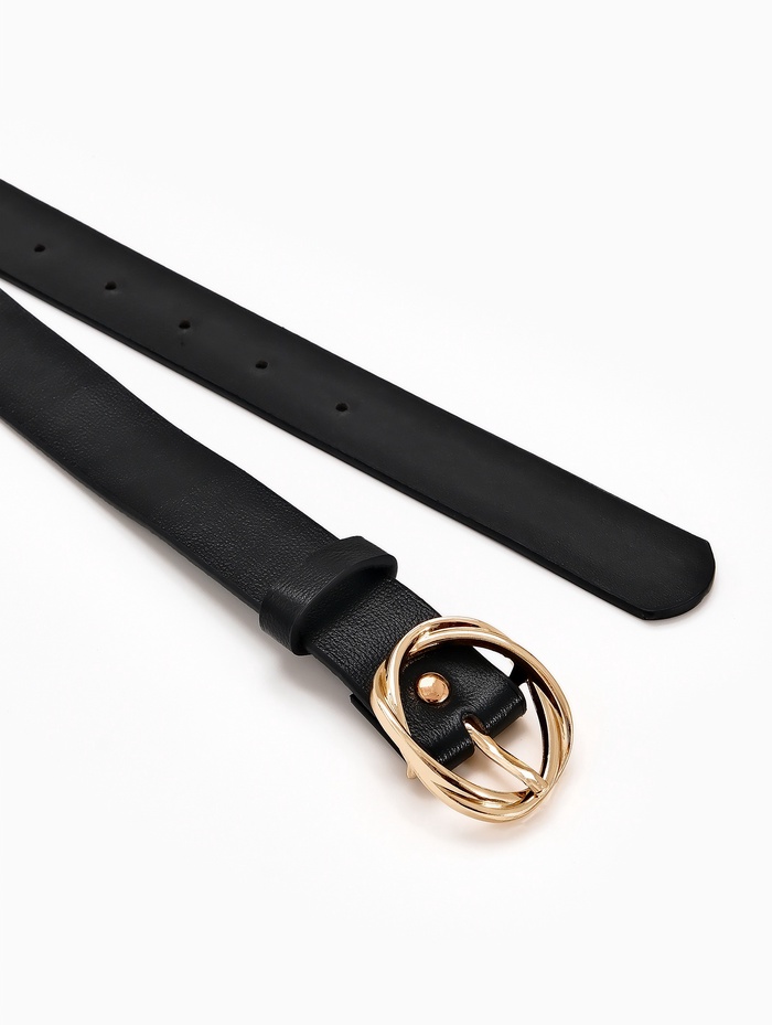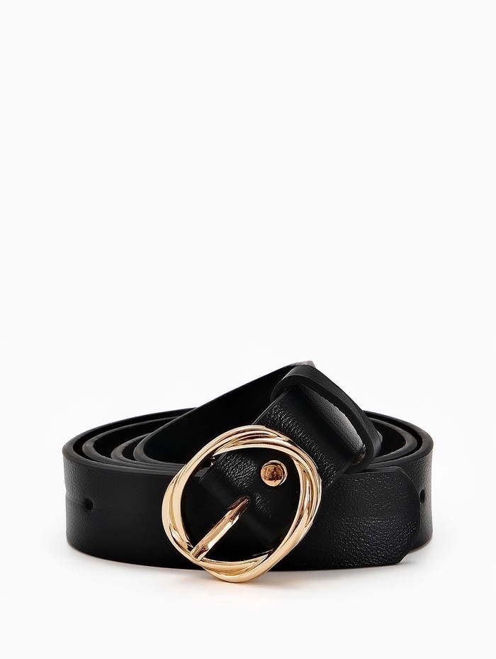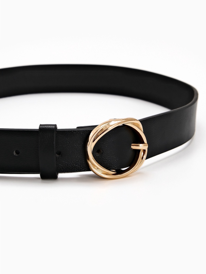 Этот женский ремень из искусственной кожи станет завершающим штрихом для ваших повседневных и выходных образов. Классическое сочетание черного цвета и золотистой пряжки легко дополняет джинсы, платья или брюки.