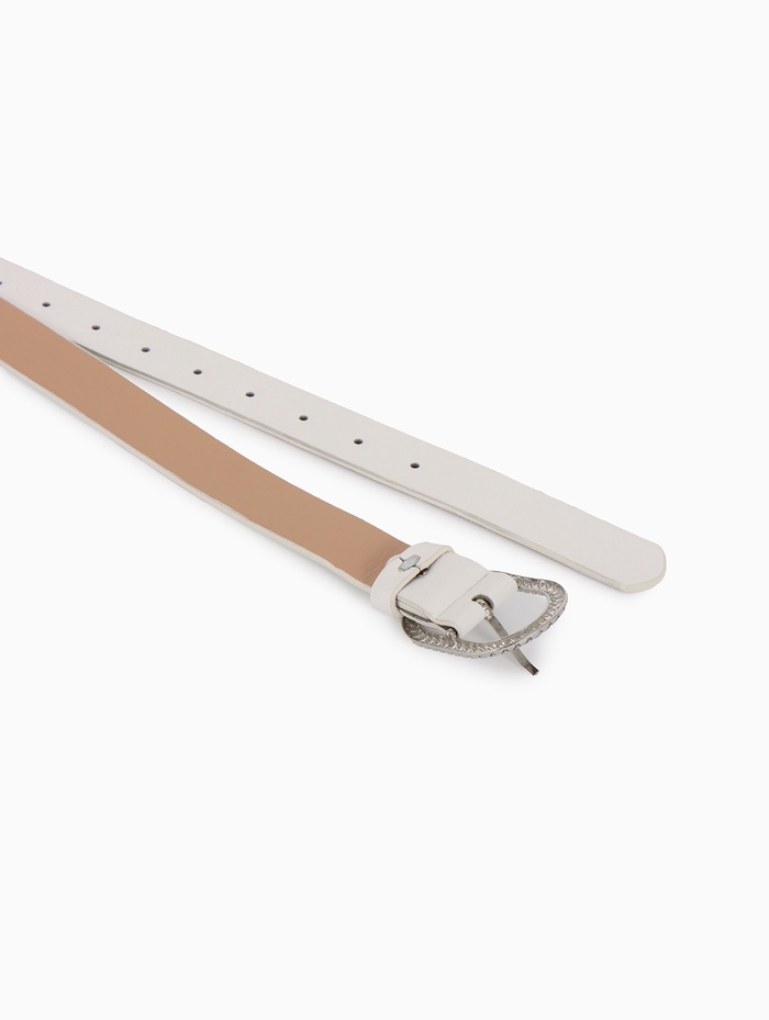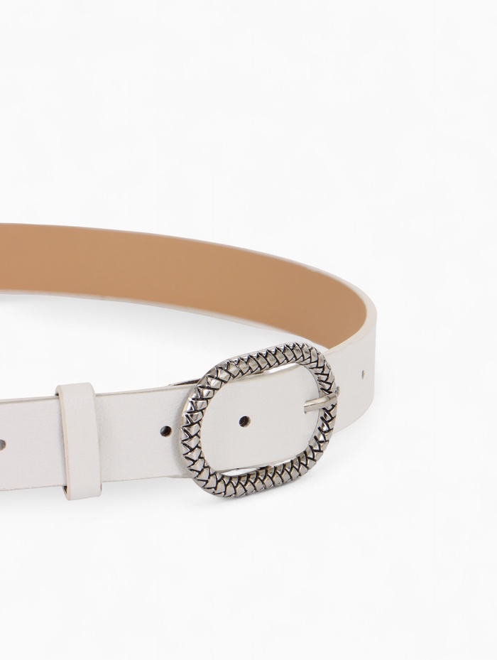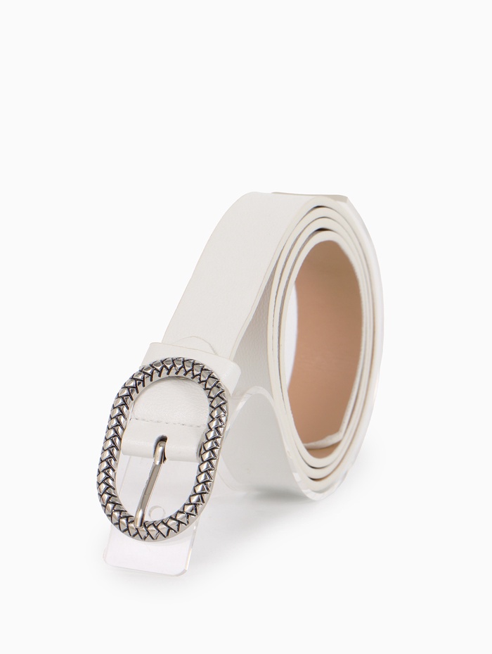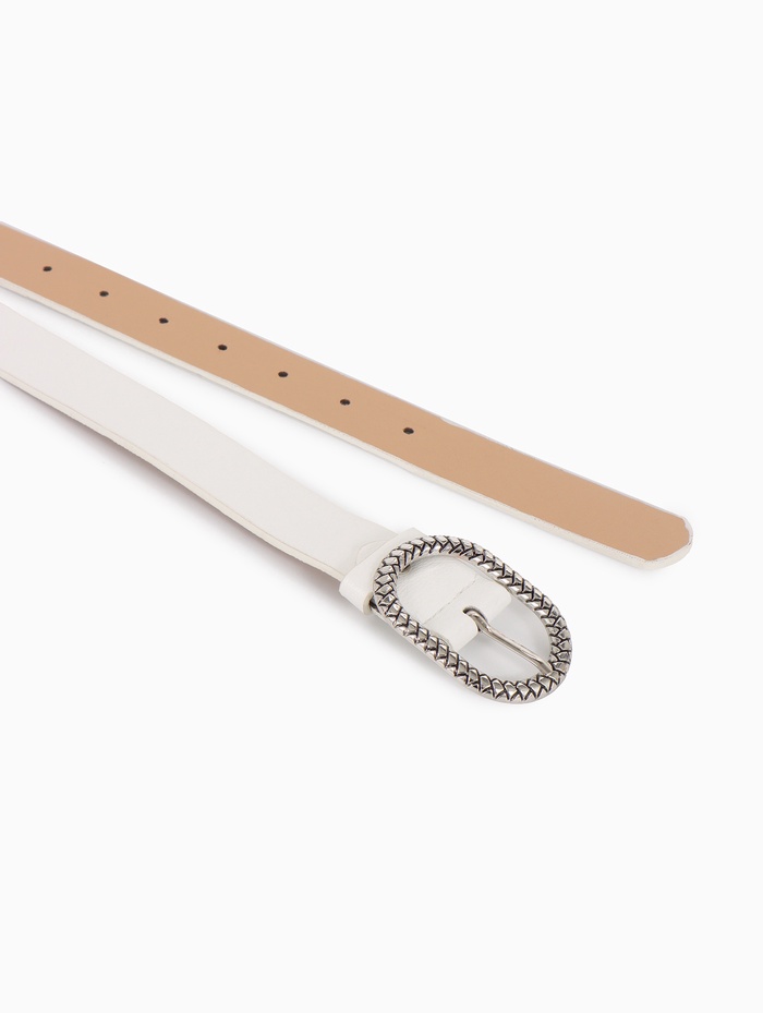 - Серебристая фурнитура контрастирует с белым материалом ремня.