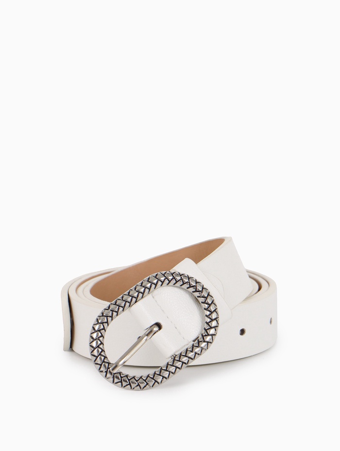 Белый ремень со съемной серебристой пряжкой — аксессуар для светлой одежды и летних образов. Он сочетается с льняными брюками, платьями и юбками, создавая свежий и завершенный силуэт.