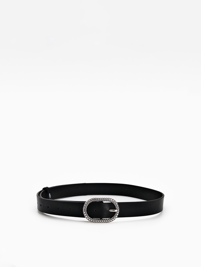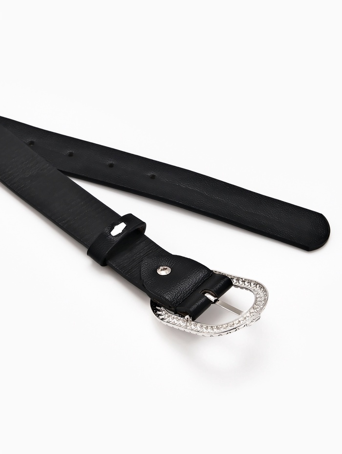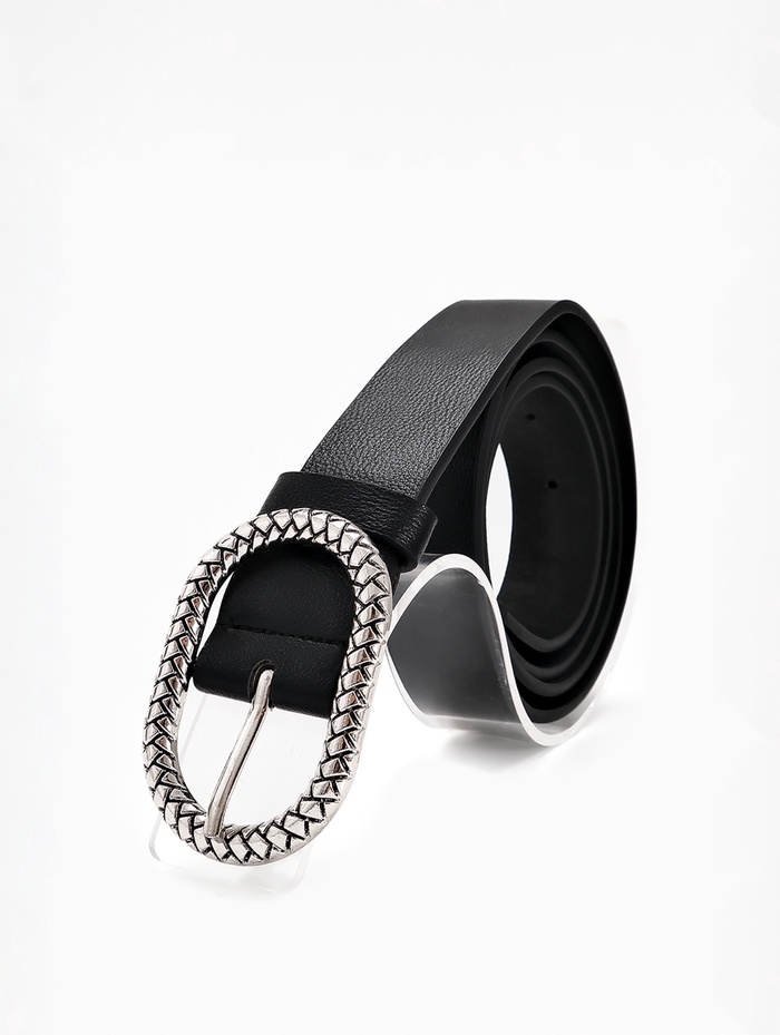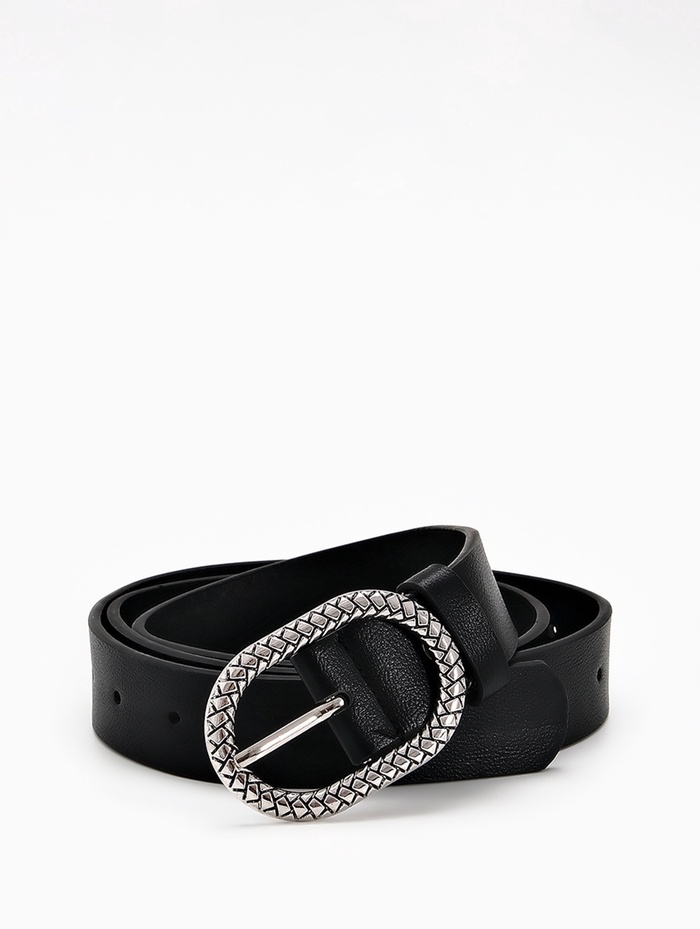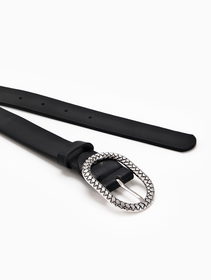Ремень сохраняет форму в течение дня, не деформируясь в области пряжки. Вы фиксируете пояс брюк или добавляете структуру в свободный силуэт платья. Аксессуар сочетается с серебристыми украшениями, завершая образ.