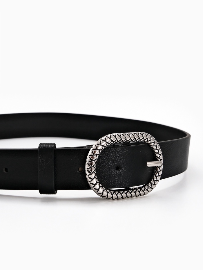 Этот черный ремень с серебристой пряжкой создает лаконичный акцент в деловом и повседневном гардеробе. Сочетание темного ремня и металлической фурнитуры подходит для строгих брюк, юбок и платьев.