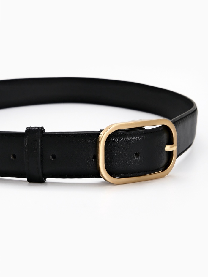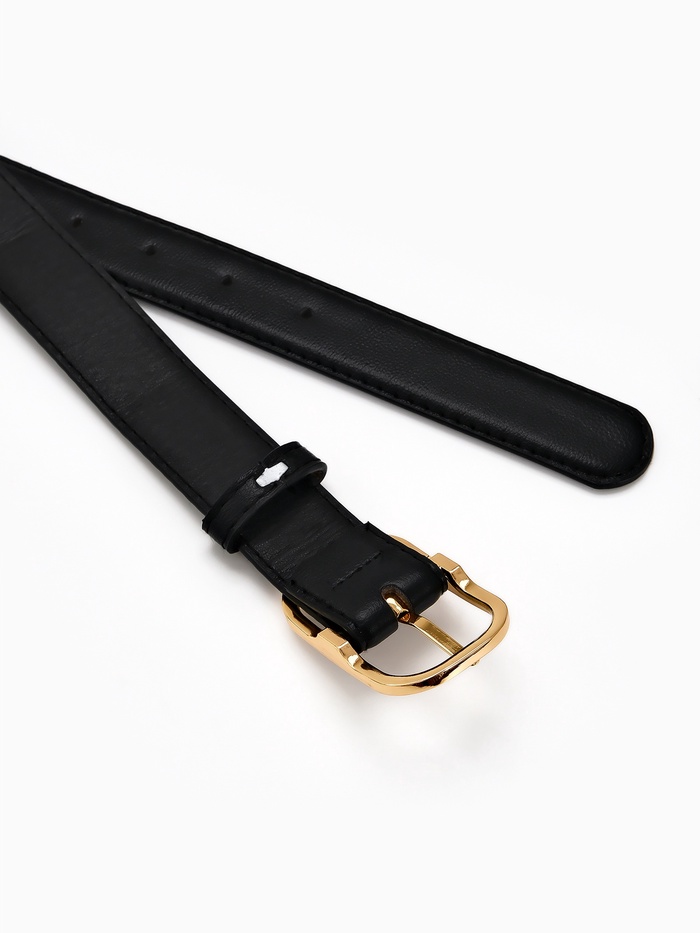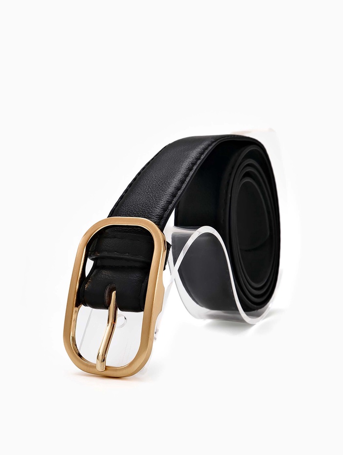 Черный ремень с золотистой пряжкой — основа гармоничного образа. Аксессуар сочетается с джинсами, платьями и брюками, создавая баланс между повседневностью и элегантностью.