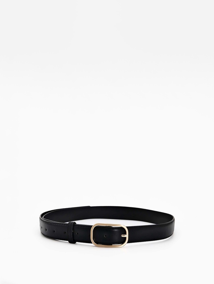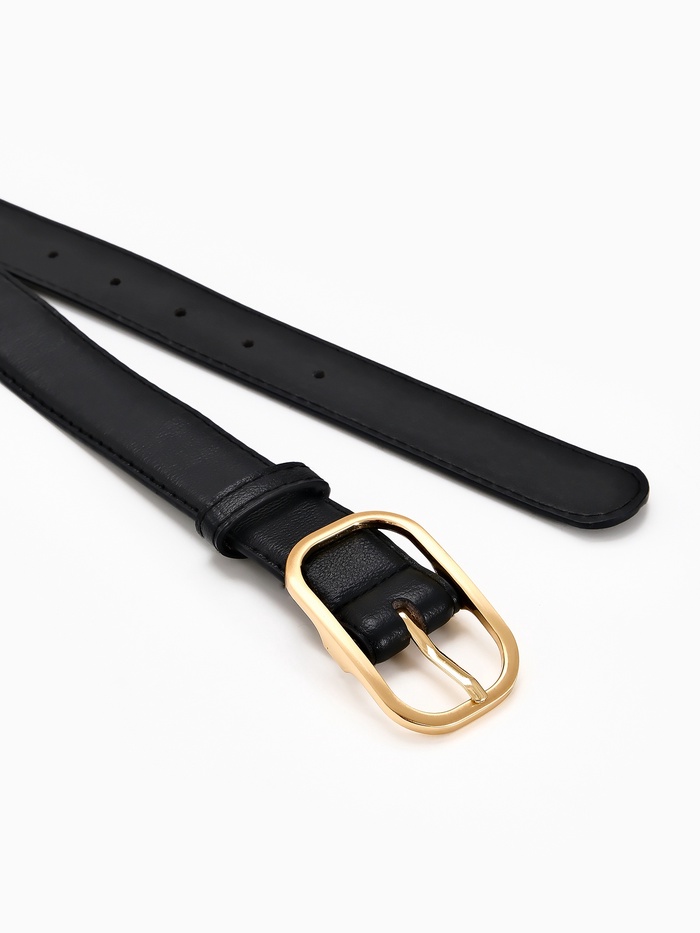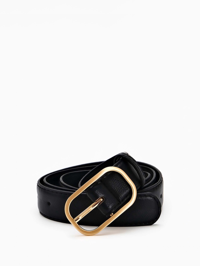 Ремень из искусственной кожи сохраняет форму, мягко лежа по линии талии. Вы подчеркиваете силуэт, сохраняя комфорт в течение дня. Аксессуар сочетается с золотыми украшениями, создавая целостность в деталях.