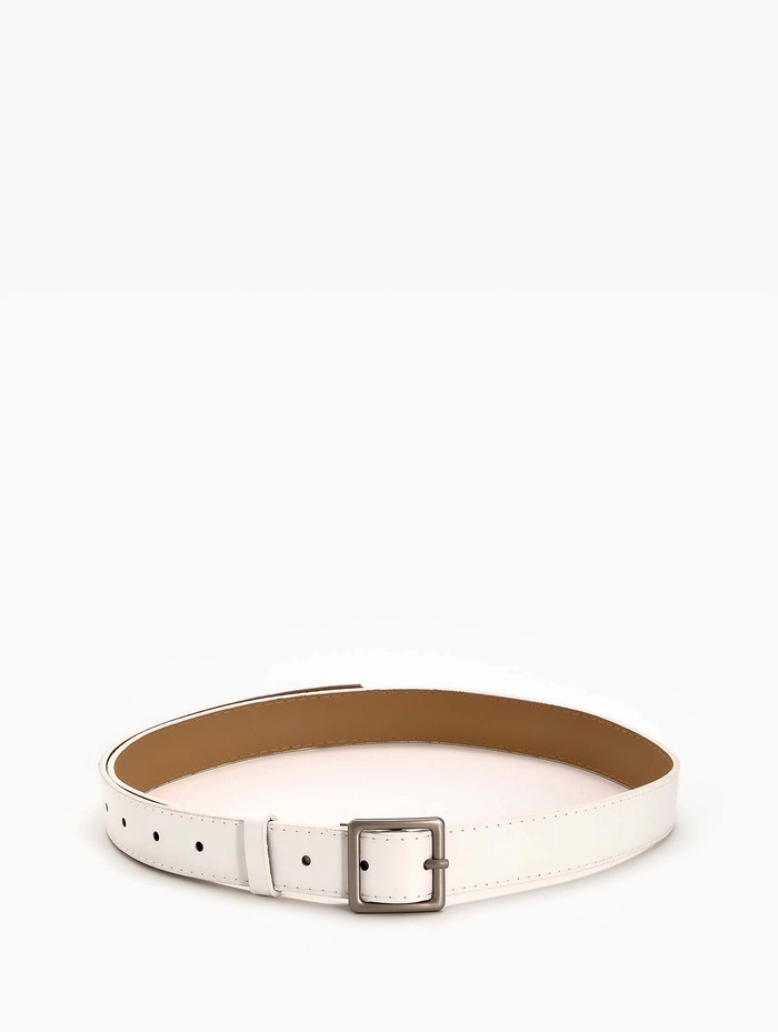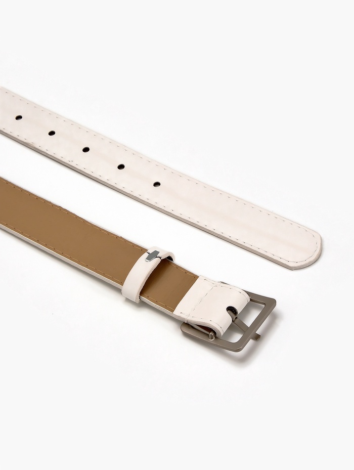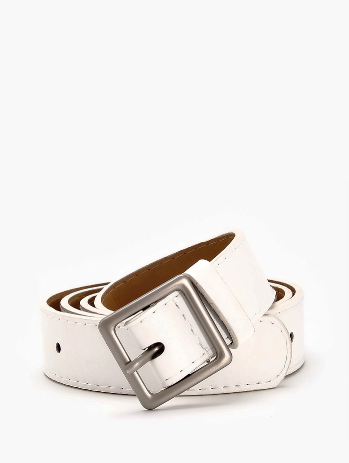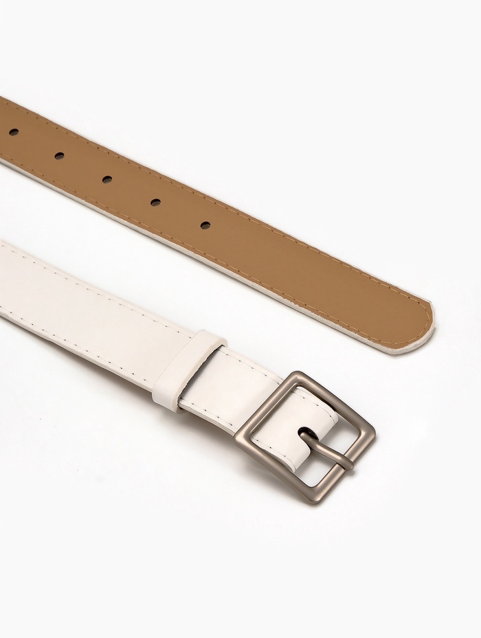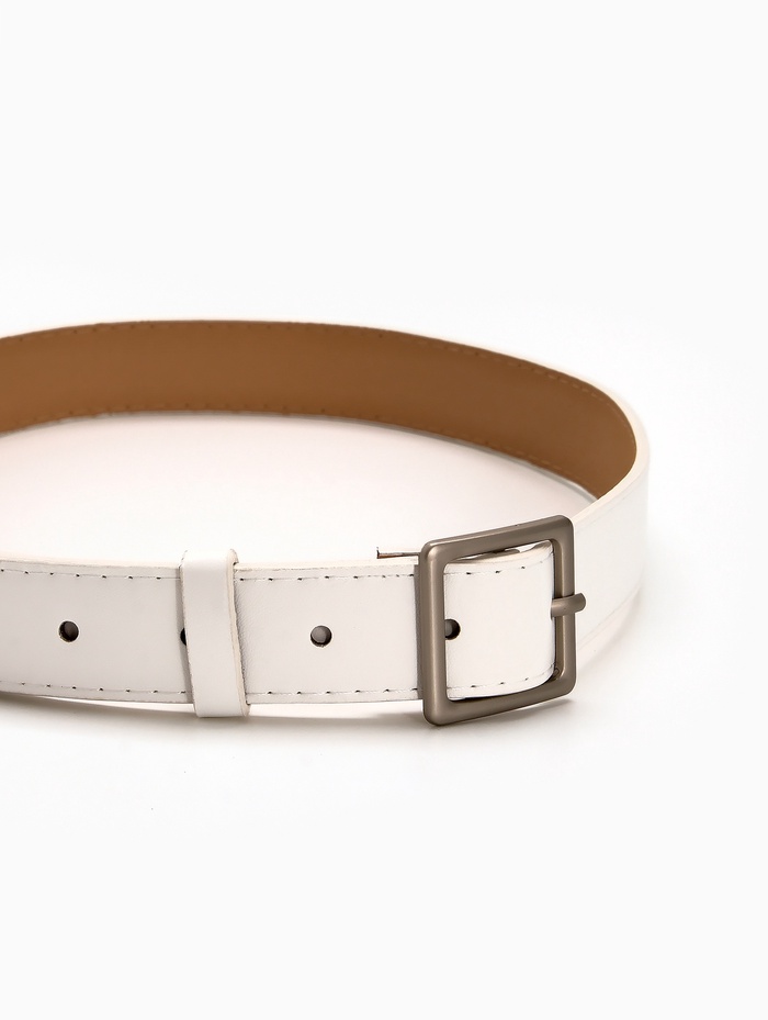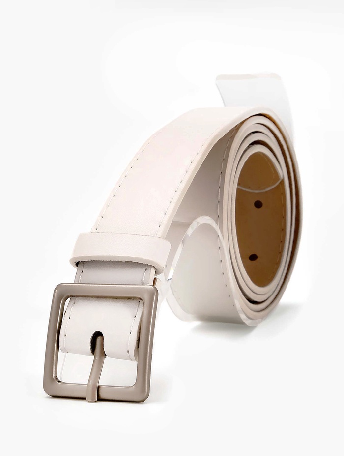 Белый ремень освежает летние платья, светлые брюки и джинсовые комплекты. Он становится связующим элементом между разными предметами одежды, сохраняя легкость восприятия. Одно отверстие на пряжке помогает найти удобное положение, а матовая поверхность создает сдержанный акцент в холодной гамме.