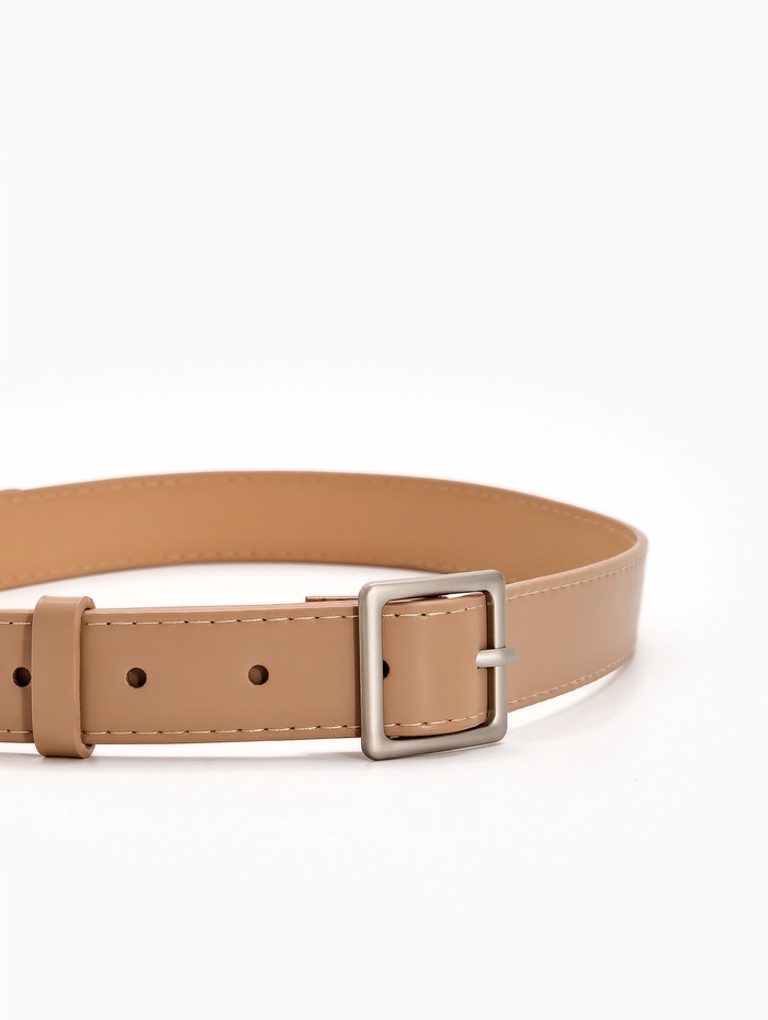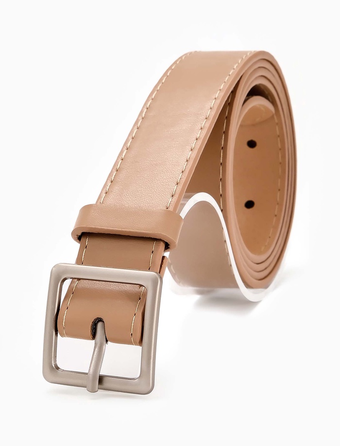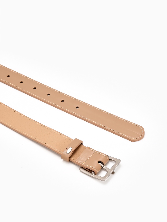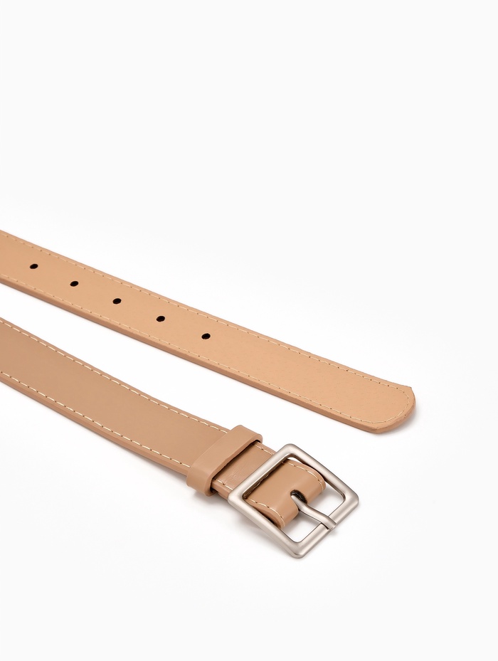 Бежевый женский ремень с матовой серебряной пряжкой легко сочетается с разными оттенками в гардеробе. Нейтральный цвет создает плавный переход между элементами образа, а матовая фурнитура добавляет современный акцент. Ширина 3 см мягко подчеркивает талию, сохраняя комфорт при повседневной носке.
