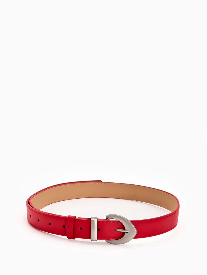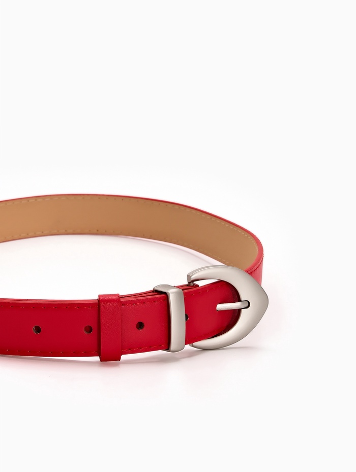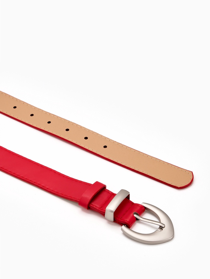 Красный ремень сочетается с базовыми вещами нейтральных оттенков, добавляя энергию в монохромные комплекты. Он становится выразительным акцентом с джинсами, черными брюками или платьем-футляром. Матовая пряжка создает современный контраст, а одно отверстие регулировки помогает найти удобное положение.