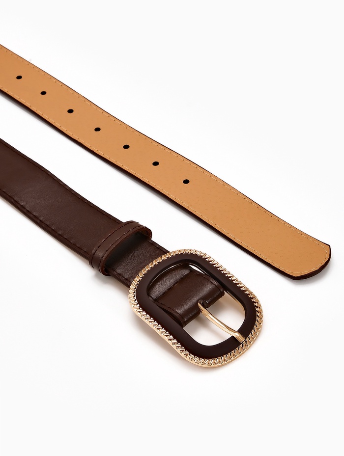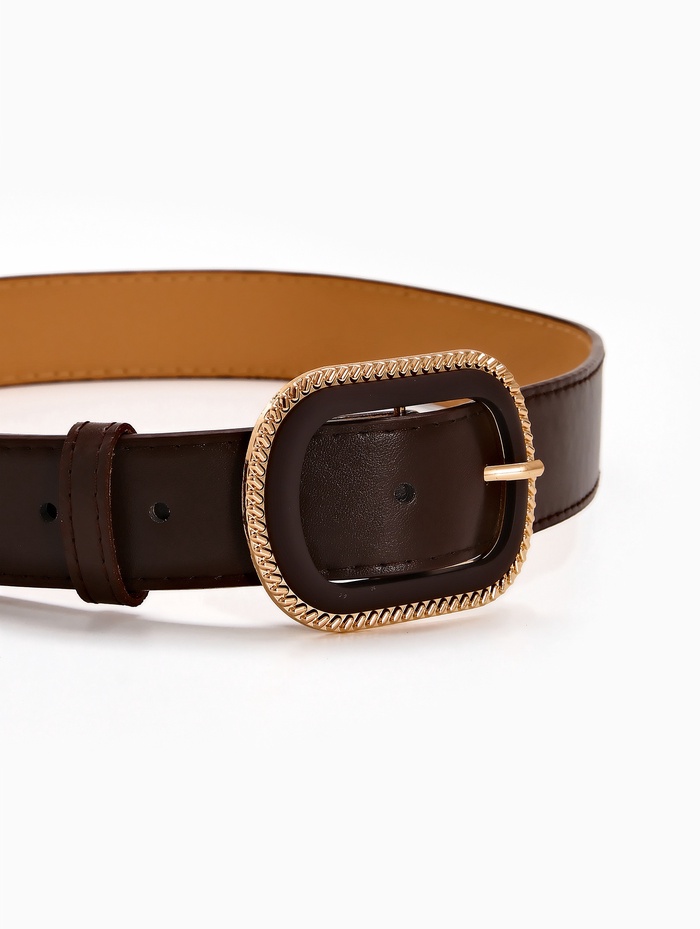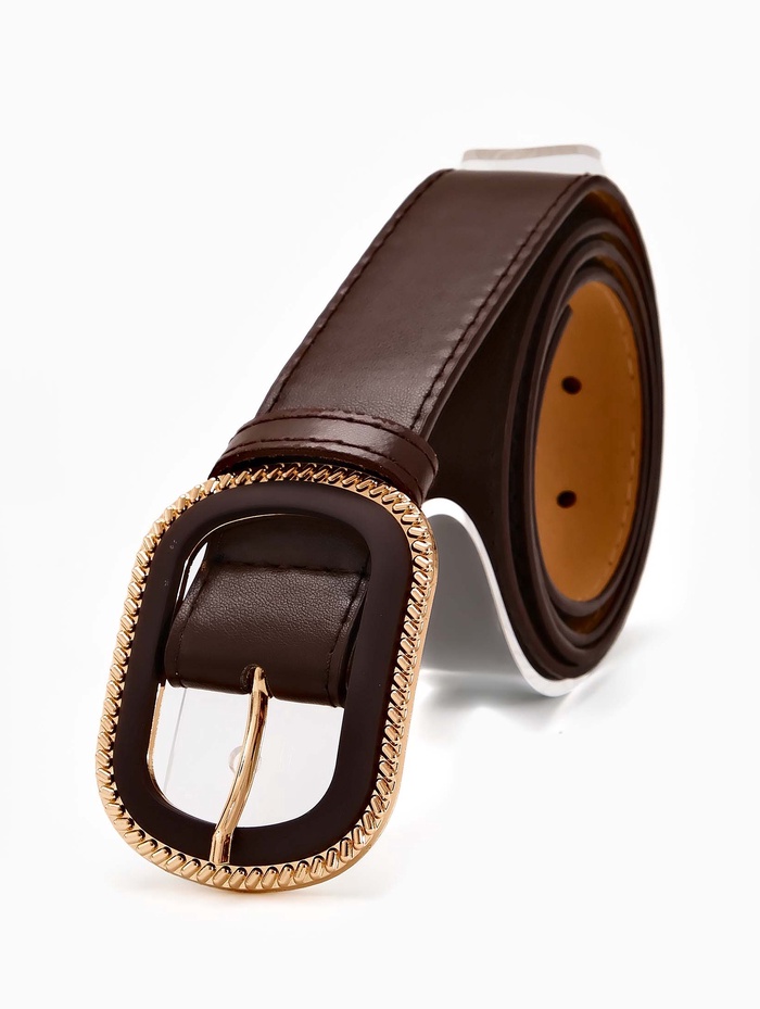 Коричневый ремень сочетается с джинсами, платьями и брюками разных стилей. Он создает гармоничный переход между светлыми и темными вещами в комплекте. Золотой элемент на пряжке добавляет теплый акцент, который сочетается с золотыми украшениями, сохраняя целостность образа.