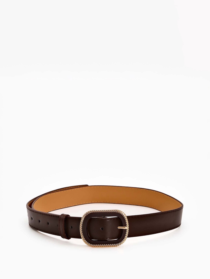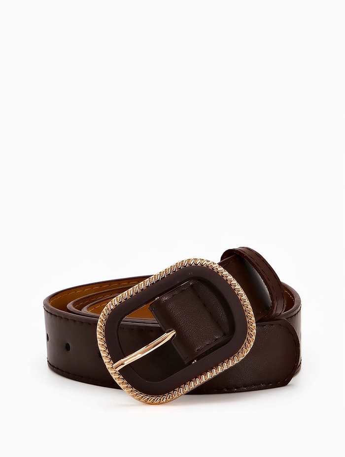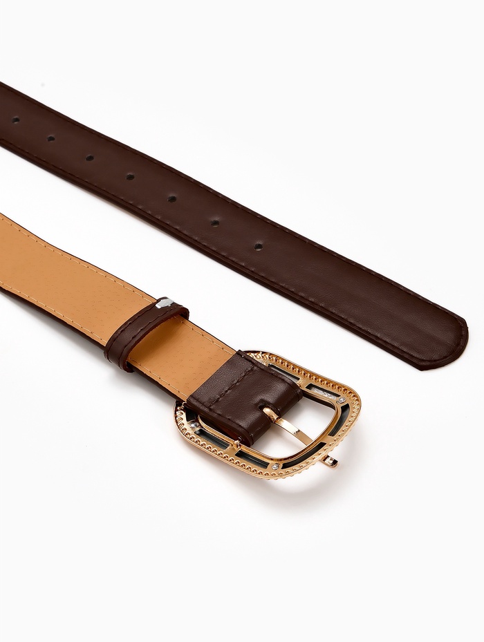 Коричневый женский ремень с комбинированной пряжкой добавляет образу теплые земляные ноты. Классический оттенок сочетается с разными цветами в гардеробе, а золотой акцент на пряжке создает элегантный контраст. Ширина 3 см мягко подчеркивает талию, сохраняя комфорт при повседневной носке.