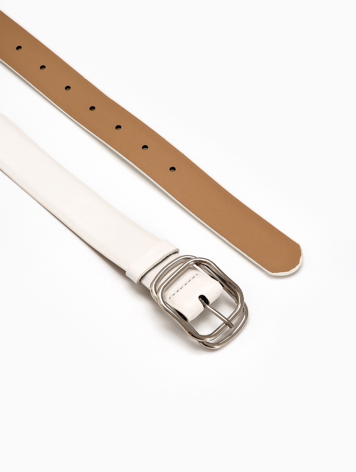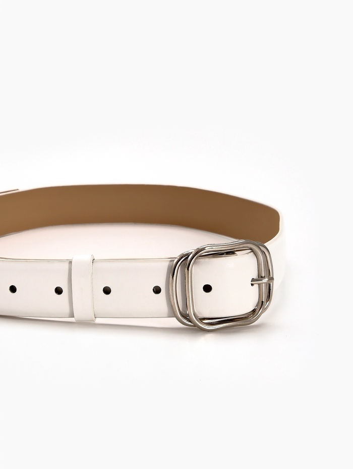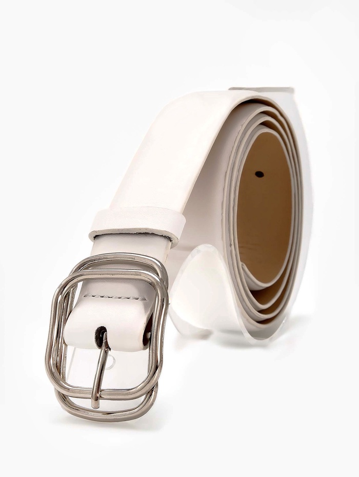 Белая широкая модель хорошо сочетается с летними платьями, легкими брюками и комбинезонами. Она добавляет структуру в свободные силуэты, сохраняя легкость образа. Серебряная пряжка создает гармоничный акцент с металлическими деталями украшений, а одно отверстие помогает точно настроить посадку по фигуре.
