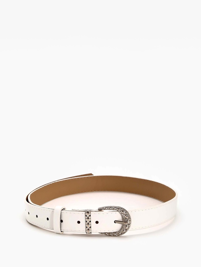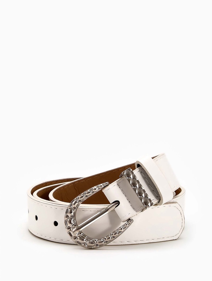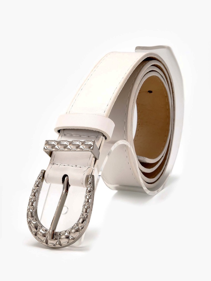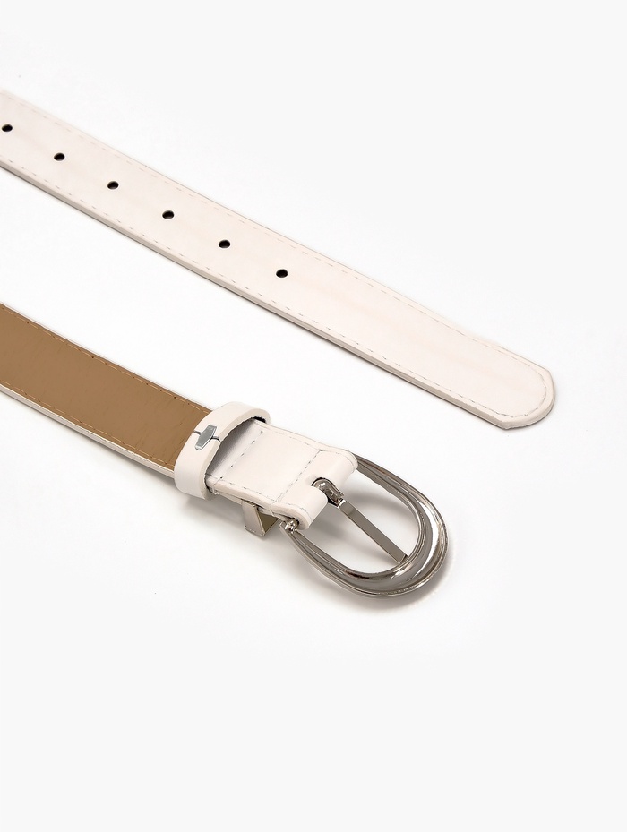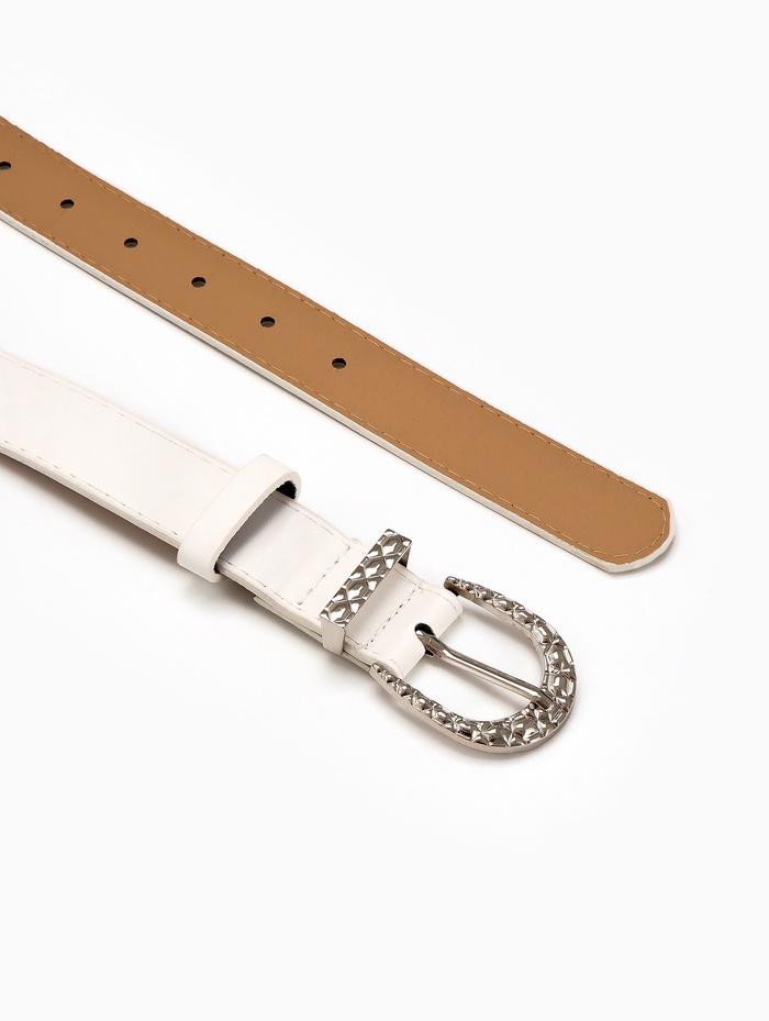 Белый ремень с серебряной пряжкой добавляет в образ свежесть и легкость. Универсальная ширина 3 см мягко определяет линию талии, сохраняя комфорт при ношении. Серебряная фурнитура создает сдержанный акцент, который сочетается с украшениями в холодной гамме.