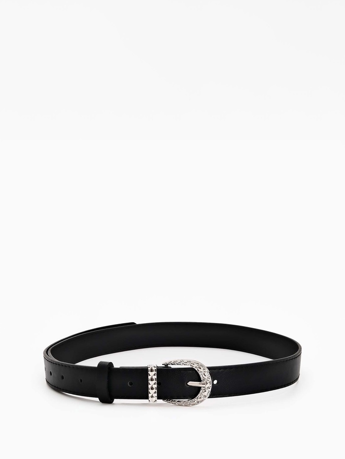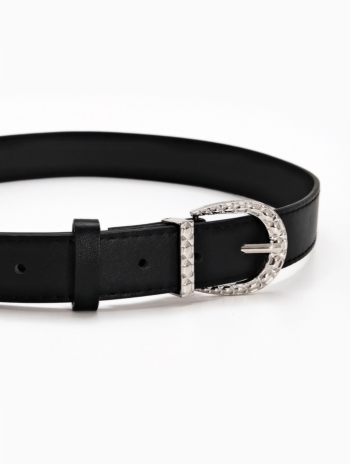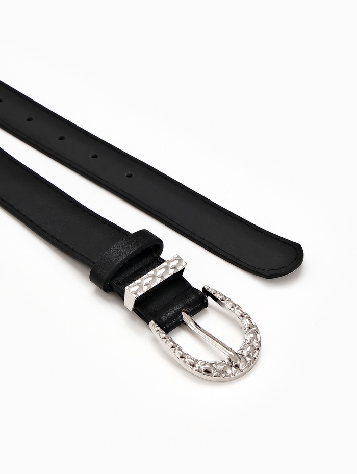 Этот ремень легко сочетается с джинсами, брюками и платьями, становясь естественным дополнением образа. Он добавляет завершающий штрих в повседневные и деловые комплекты, сохраняя их гармонию. Одно отверстие на пряжке помогает найти удобное положение, а серебряный акцент гармонирует с металлическими деталями аксессуаров.