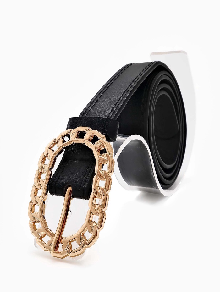 Женский ремень чёрного цвета с золотой пряжкой имеет классическую ширину 2,5 см, которая подходит для повседневной носки. Модель сохраняет лаконичный силуэт, мягко подчёркивая линию талии. Золотистая фурнитура добавляет акцент, не перегружая образ.
