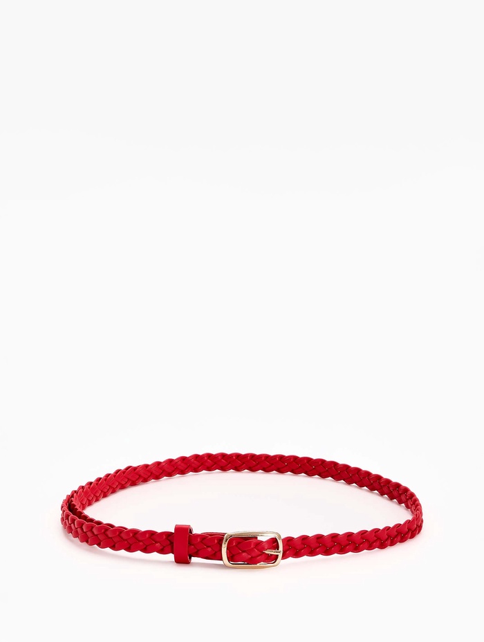 Красный ремень с золотой пряжкой сочетается с базовыми вещами нейтральных оттенков — чёрными, белыми, джинсовыми. Он создаёт контраст, не нарушая гармонии образа. Одно отверстие на пряжке помогает точно определить посадку, сохраняя удобство в течение дня.