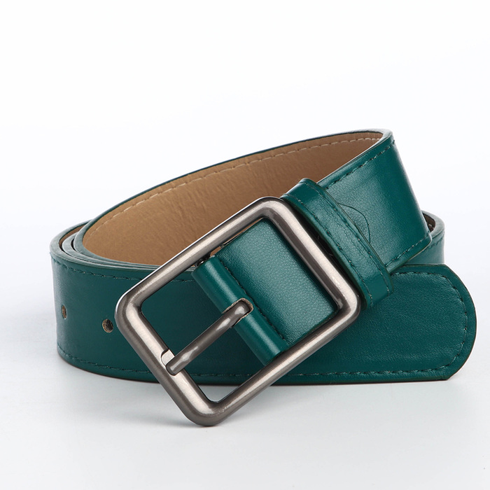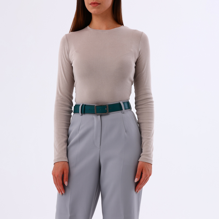 Зеленый женский ремень с темной пряжкой создает сдержанный акцент в повседневном гардеробе. Ширина 3.5 см сохраняет баланс между тонкими и широкими моделями.