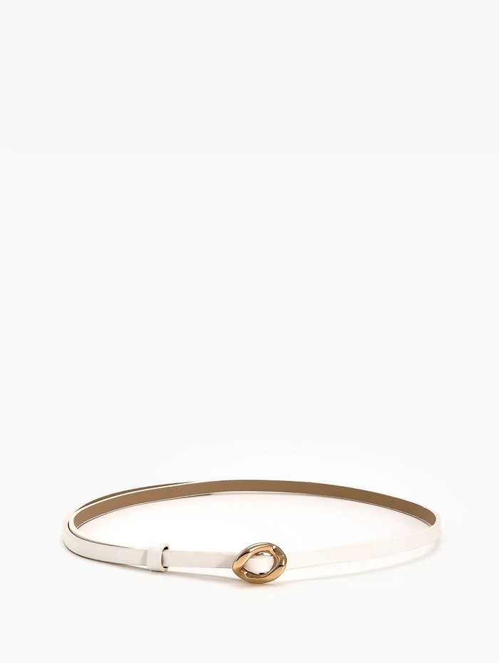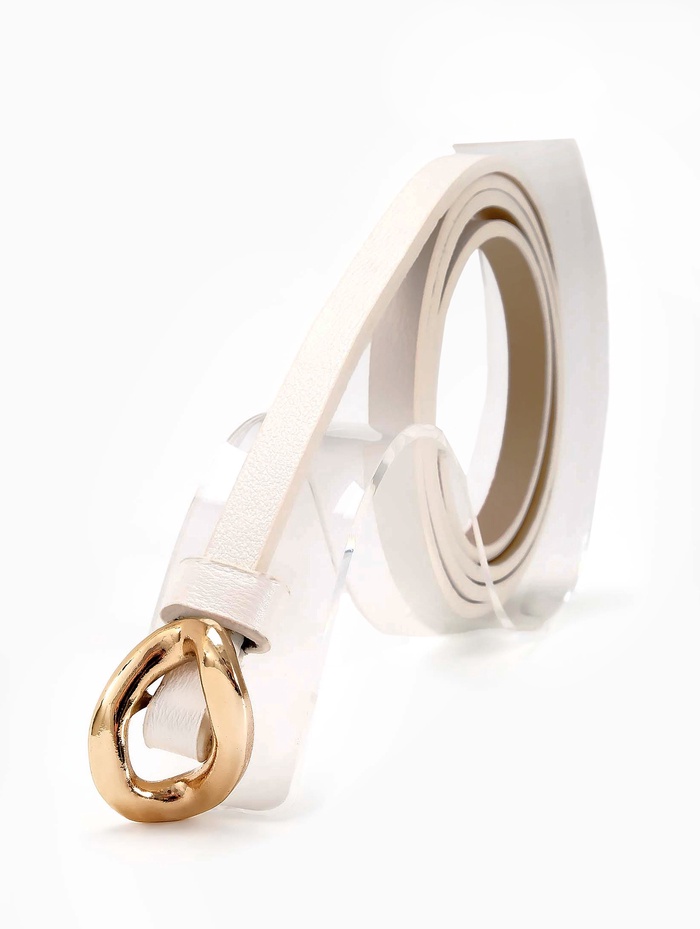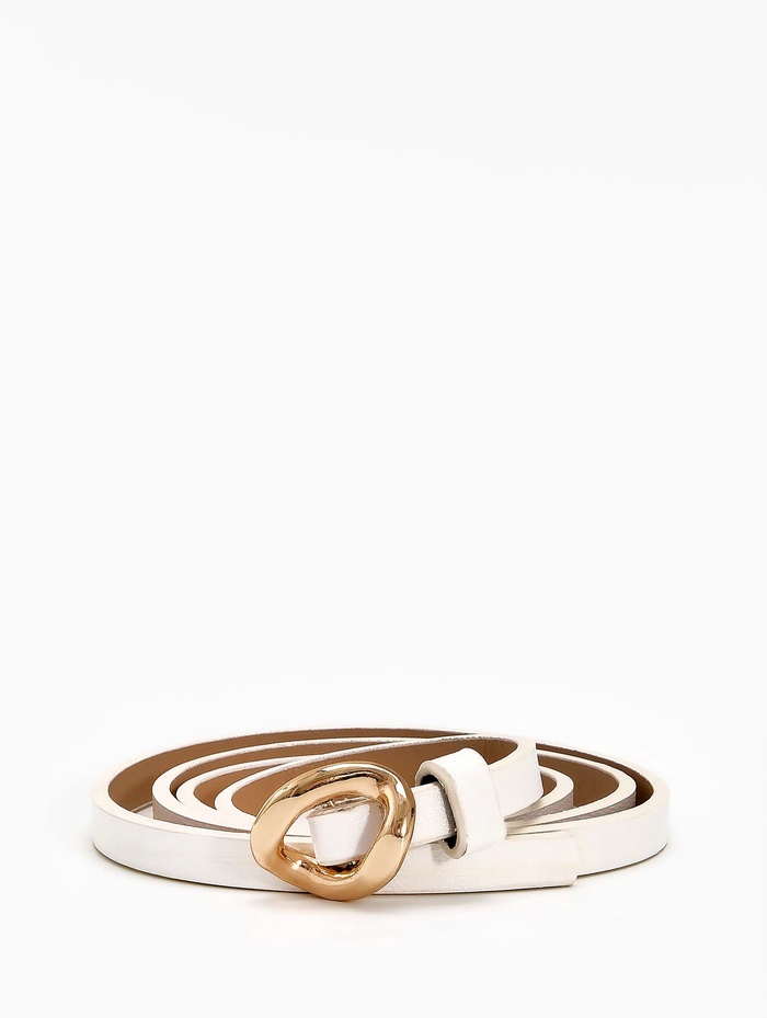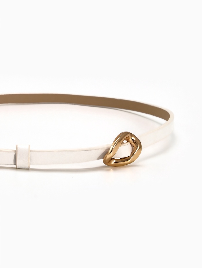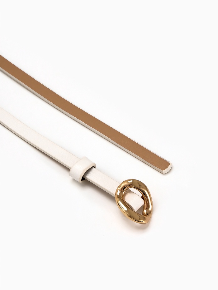 Тонкий белый ремень-затяжка с золотистой фурнитурой создает воздушный акцент на летних платьях и туниках. Светлый оттенок и деликатная конструкция подчеркивают талию, сохраняя легкость летнего образа.