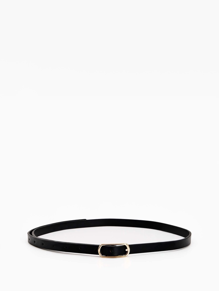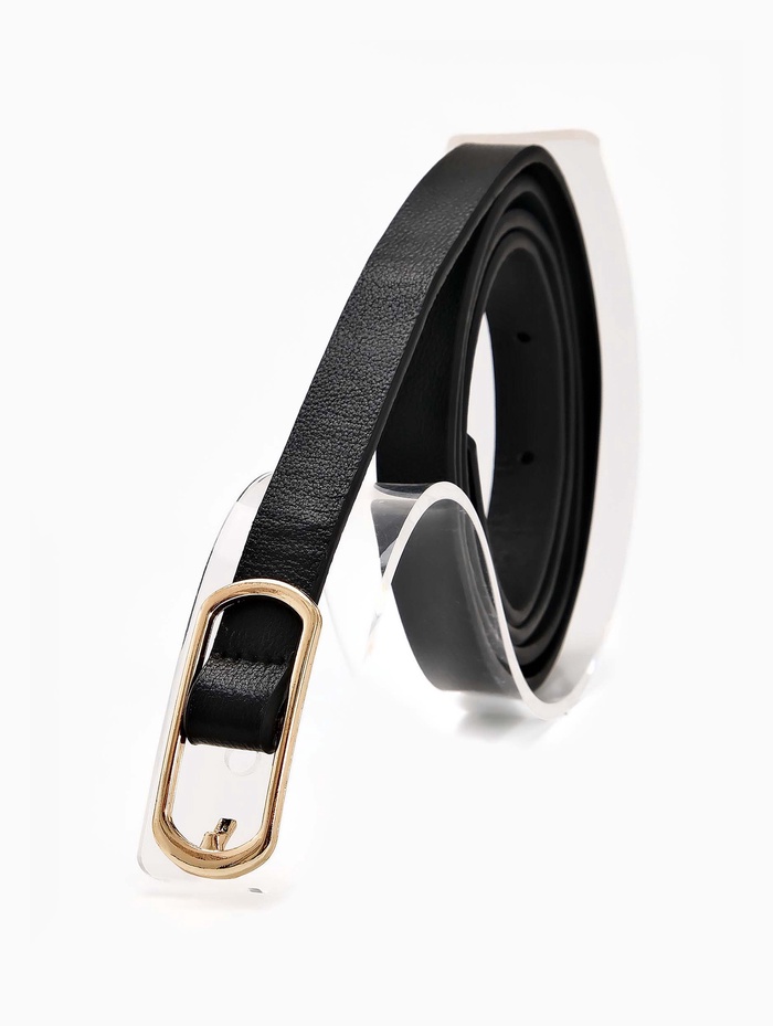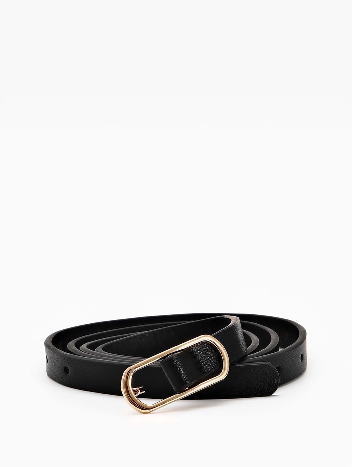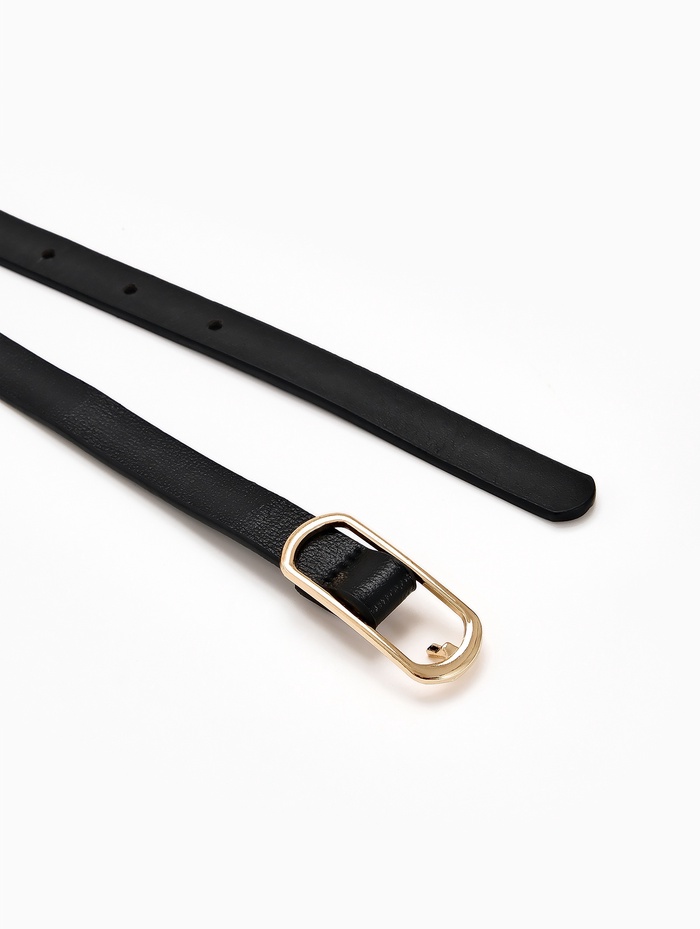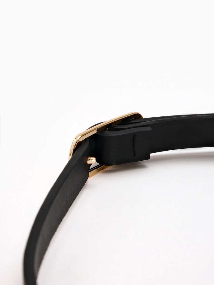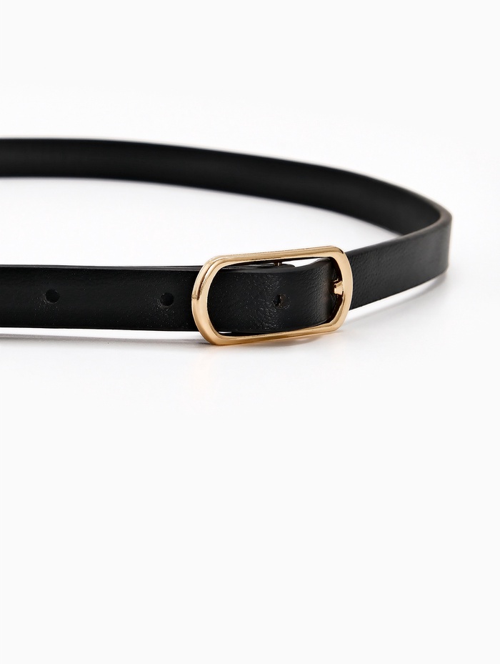 Узкий черный ремень с золотистой пряжкой создает сбалансированный акцент для платьев и брюк. Промежуточная ширина сочетает изящество тонких моделей и функциональность классических аксессуаров.
