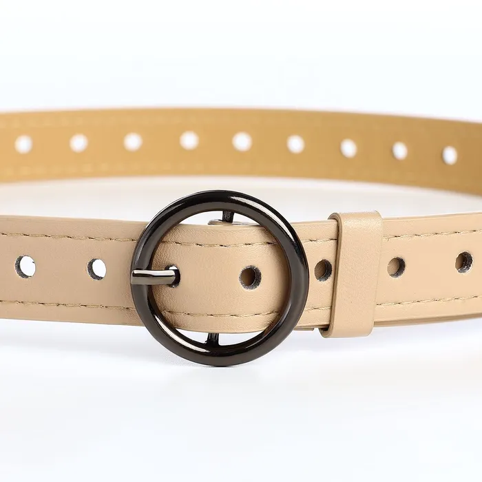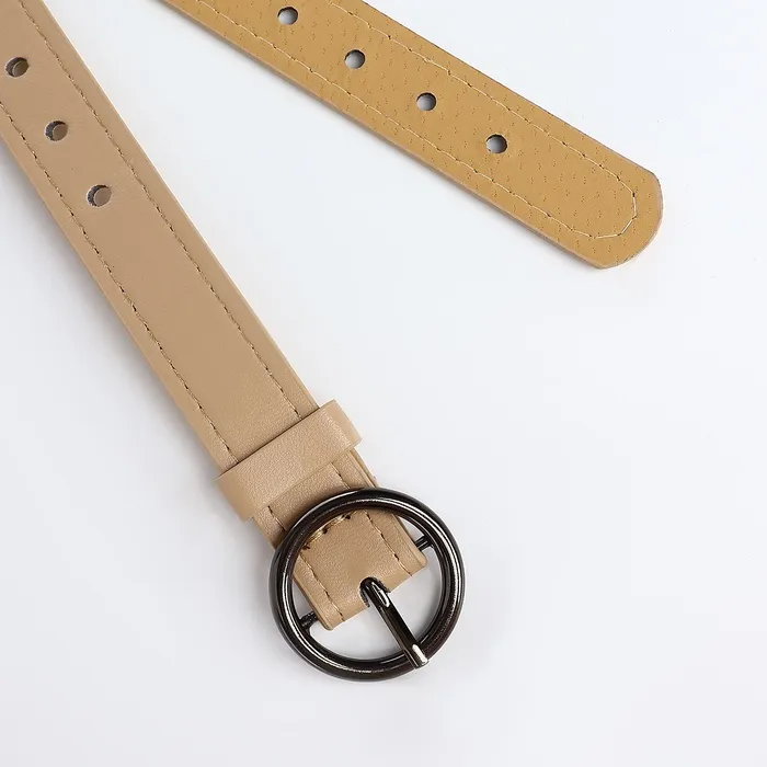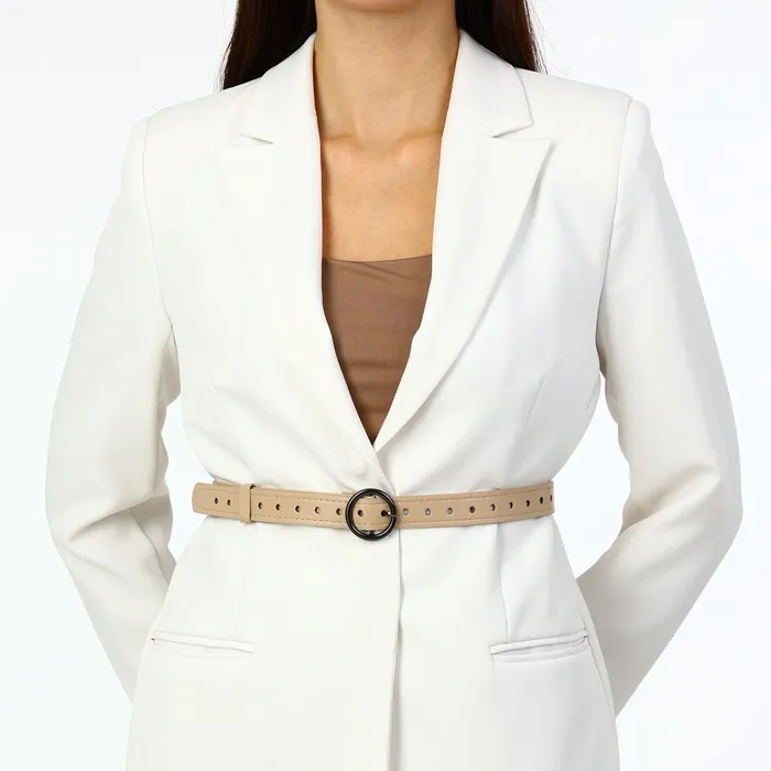 Тонкий женский ремень с круглой пряжкой в бежевом цвете придает образу мягкость и завершенность. Светлый оттенок визуально объединяет элементы гардероба, создавая гармоничный силуэт. Круглая пряжка из темного металла добавляет лаконичный акцент, сохраняя общую сдержанность стиля.