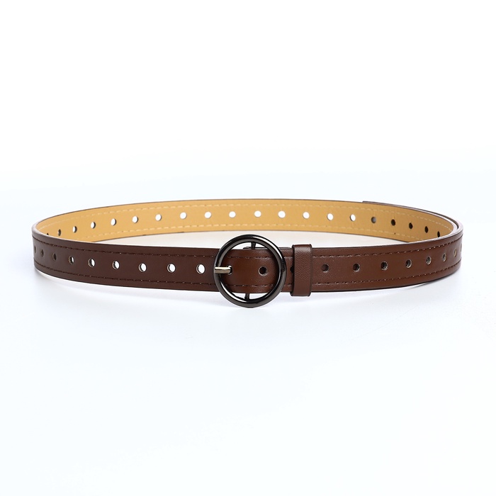 Тонкий женский ремень с круглой пряжкой в коричневом цвете добавляет образу утонченности. Мягкий коричневый оттенок создает теплый акцент, гармонирующий с натуральными тонами в гардеробе. Круглая пряжка из темного металла придает классическому дизайну современное звучание.