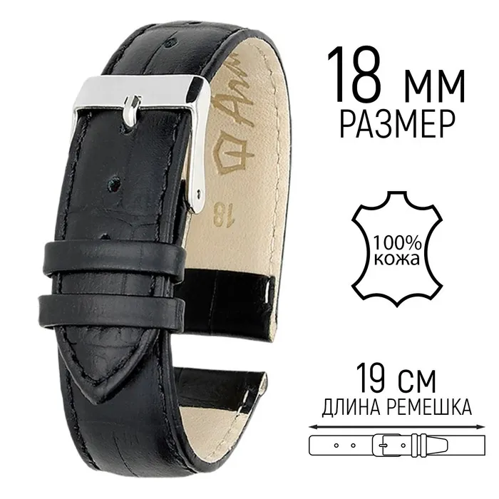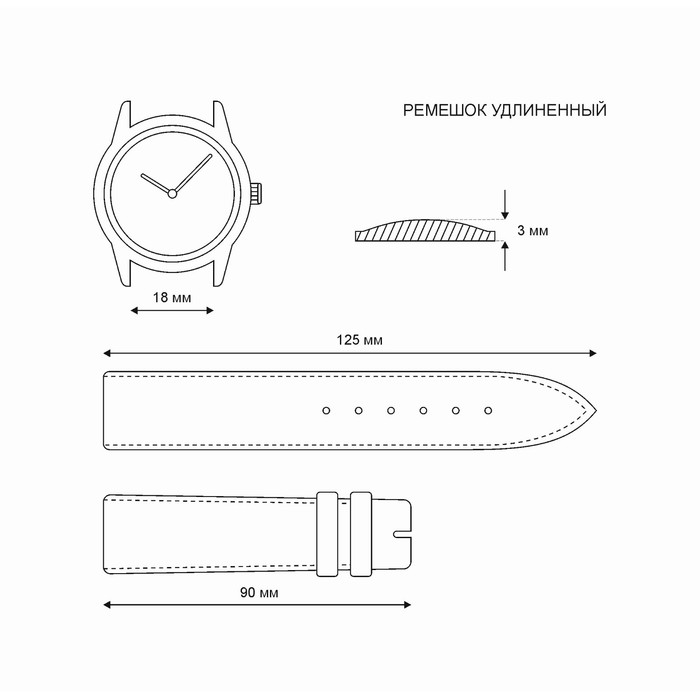 Ремешок для часов, мужской, 18 мм, запряжник 90 мм, горт 125 мм, нат. кожа, удлиненный — Характеристики