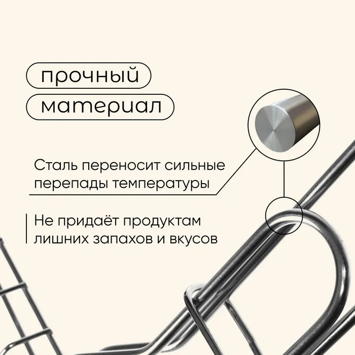 - Рабочая поверхность решётки выполнена из нержавеющей стали. Материал хорошо переносит перепады температуры и не придаёт продуктам лишних запахов и вкусов.
