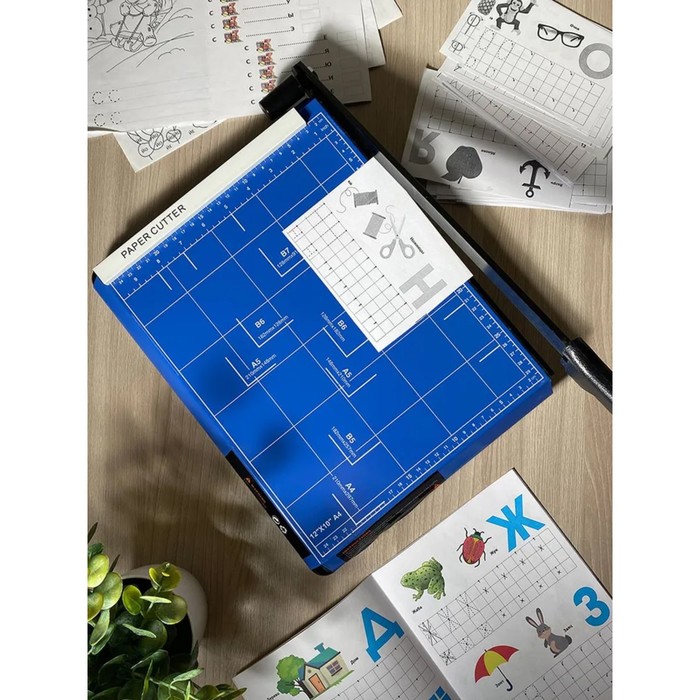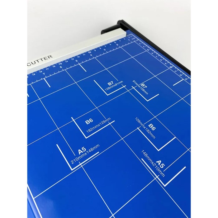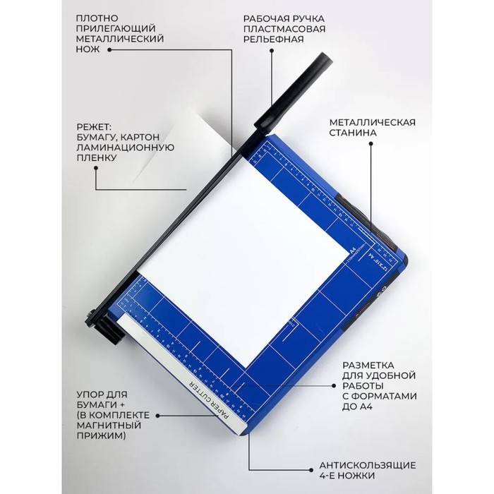 наличие упора для края бумаги; ручной прижим бумаги; градуировка рабочего стола (см, дюймы); прорезиненные ножки.