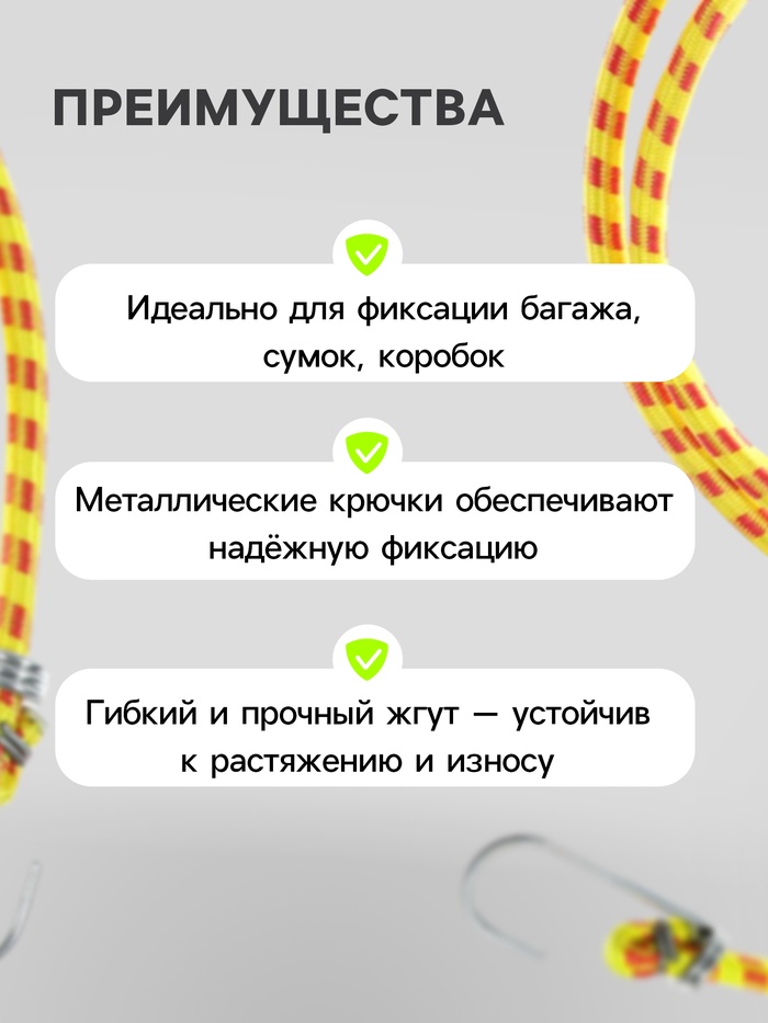 Резинки крепления TORSO надёжно зафиксируют багаж и обеспечат его сохранность при перевозке. Изделия представляют собой шнур из эластичного материала с прочными металлическими крючками на концах.