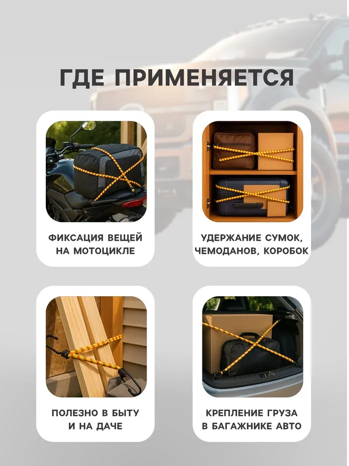 Резинки крепления TORSO надёжно зафиксируют багаж и обеспечат его сохранность при перевозке. Изделия представляют собой шнур из эластичного материала с прочными металлическими крючками на концах.