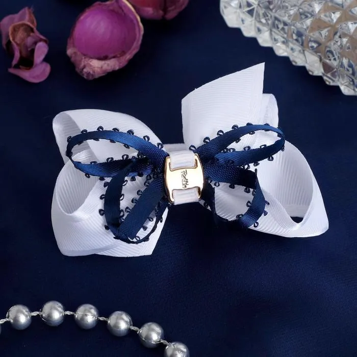Оригинальная детская резинка с бантом станет стильным дополнением к школьной форме вашей дочери. Этот аксессуар выдержан в классической цветовой гамме: чистый белый и насыщенный синий. Резинка предусмотрена специально для маленьких модниц, чтобы их прически выглядели аккуратно и красиво на протяжении всего насыщенного дня.