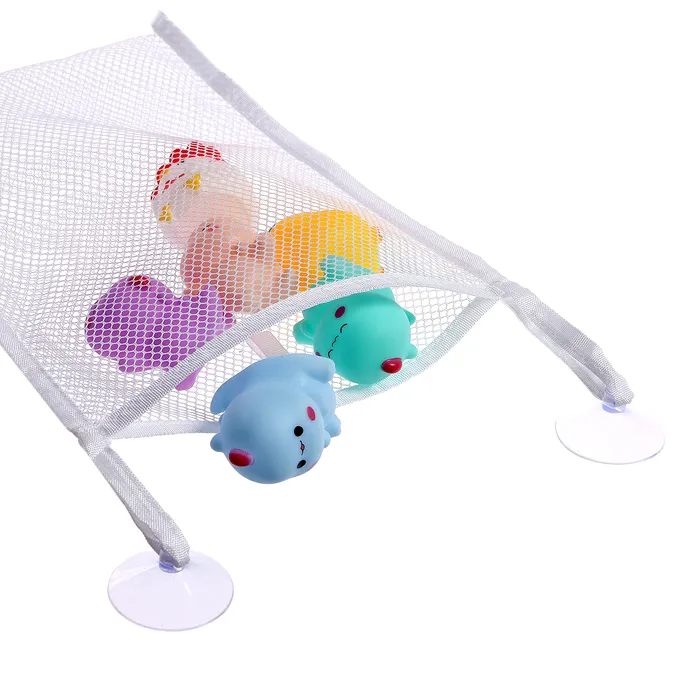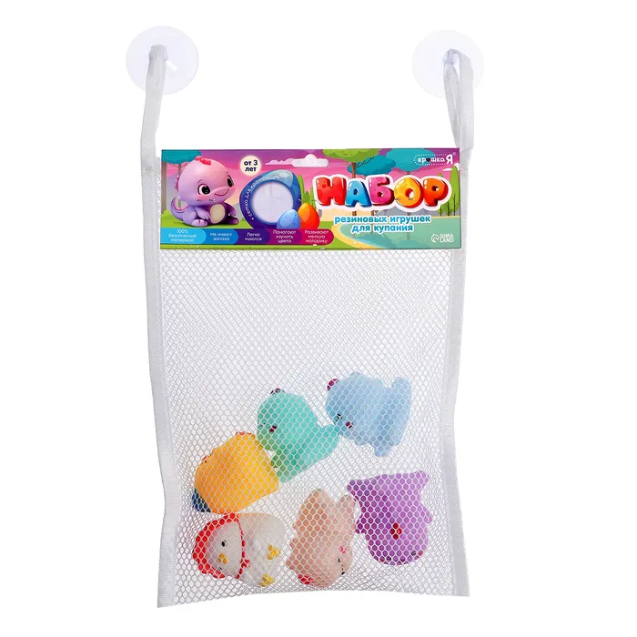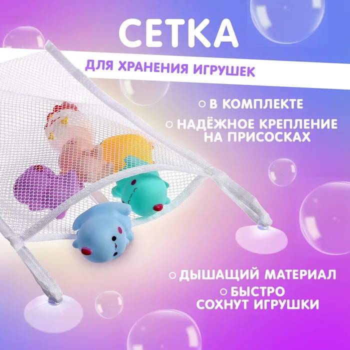 - В комплекте идёт специальная сетка с надёжными присосками, которая поможет вам удобно хранить игрушки после купания.