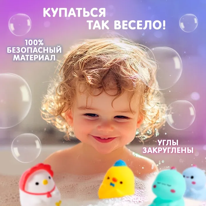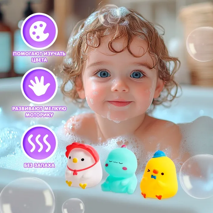 Набор резиновых игрушек станет отличным подарком для детей от 3 лет. Он подойдёт как для игр в ванной, так и для развития мелкой моторики вне воды. Яркие цвета и забавные формы обязательно привлекут внимание малыша и сделают купание ещё более приятным.