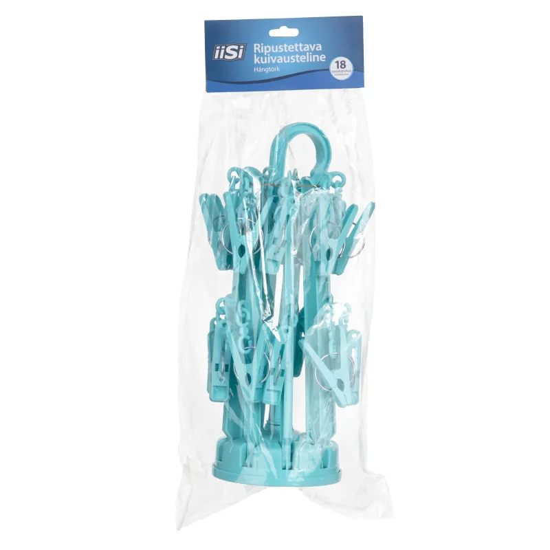 Красивая и практичная подвесная сушилка Iisi идеально подходит для сушки мелкого белья, такого как носки и нижнее белье. Она выполнена из полипропилена и оснащена 18 прищепками, которые позволяют вместить много мелких вещей. Изделие представлено в стильном бирюзовом цвете.