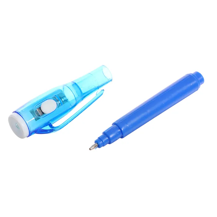 - У ручки-фонарика есть ещё одна функция — невидимые чернила. Снимите колпачок и напишите что-нибудь на листе бумаги, а затем посветите на надпись фонариком. Рисунок проявится.